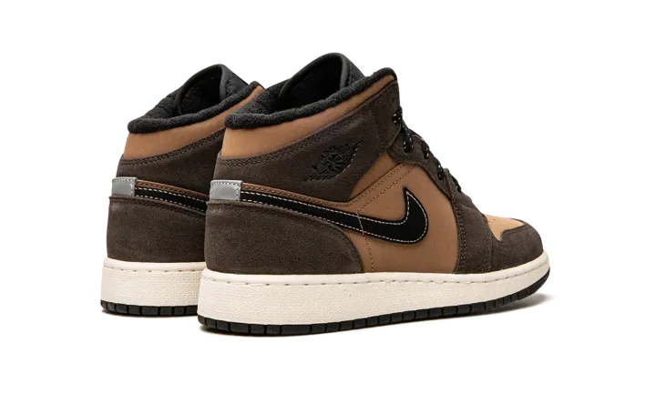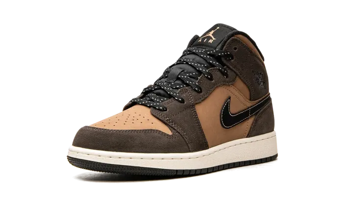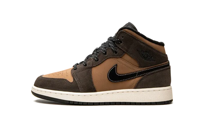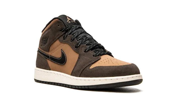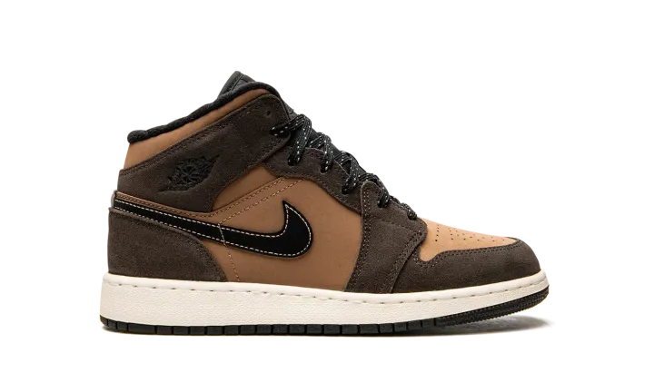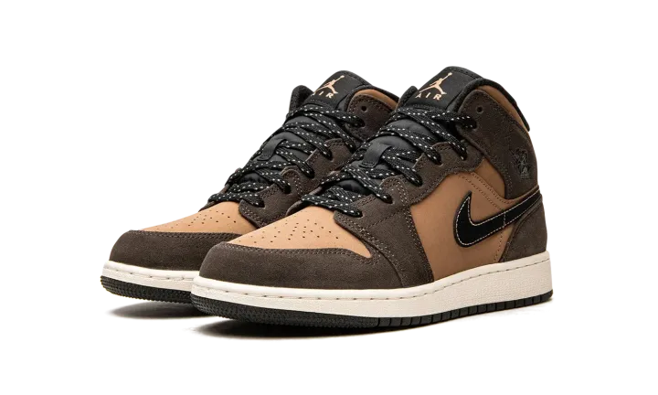 The Air Jordan 1 Mid GS "Earth Tone" is the youth sizing of Michael Jordan's first signature shoe in a muted colorway. As its name suggests, the "Earth Tone" Jordan 1 Mid GS arrives in wearable, neutral shades, specifically light and dark brown. The overlays on the forefoot, eyelets, collar, and heel appear in Dark Chocolate suede while the base of the shoe is outfitted with Crimson Bliss-colored suede. A black Swoosh with white contrast stitching is found on both sides of the shoe. Additional branding appears in the form of a black "Wings" logo on the collar and a Crimson Bliss Jumpman with "Air" detailing on the black nylon tongue.