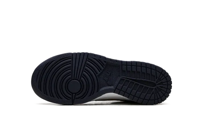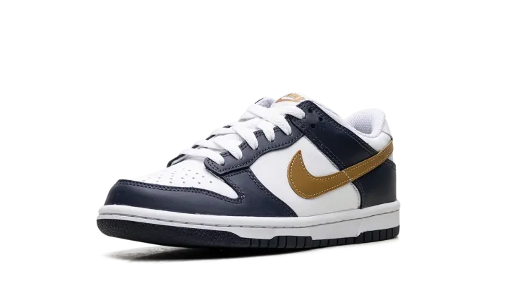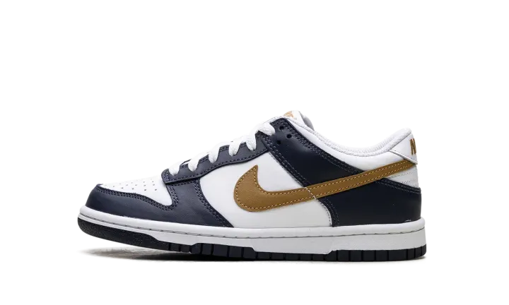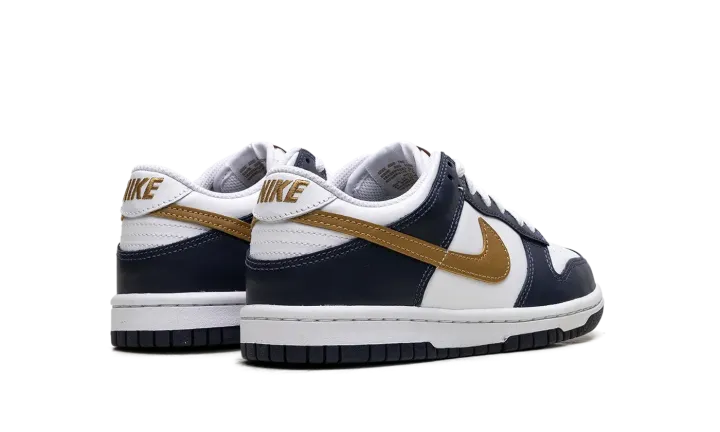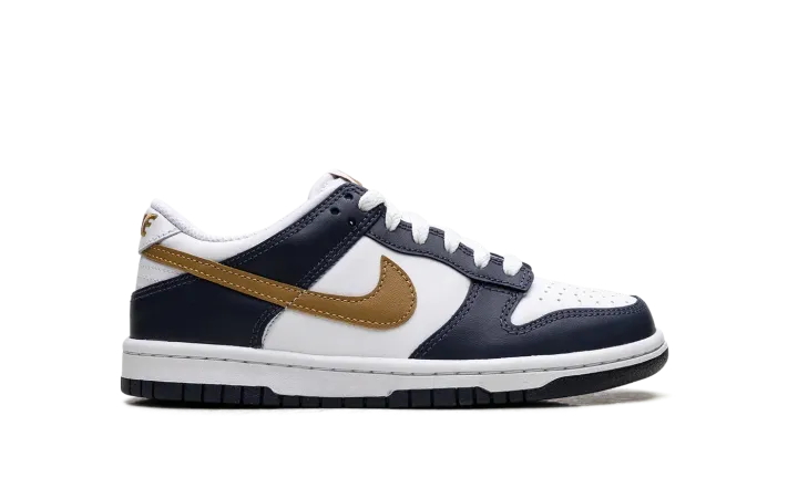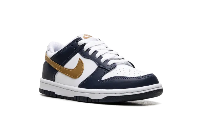 The Nike Dunk Low GS 'Midnight Navy Wheat' combines a crisp white leather foundation with contrasting navy overlays at the forefoot and heel.