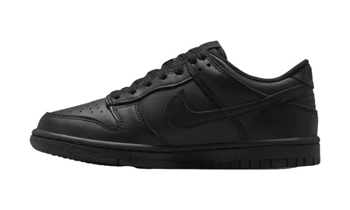 The 2025 edition of the Nike Dunk Low GS 'Triple Black' delivers a tonal black finish on the leather upper, featuring heritage details that include a perforated toe box and a breathable nylon tongue.