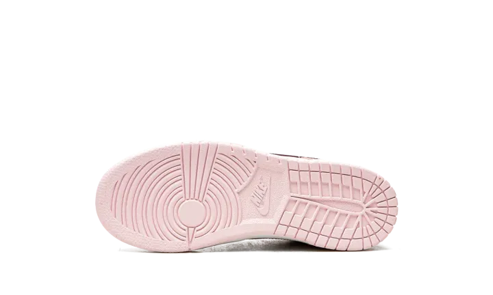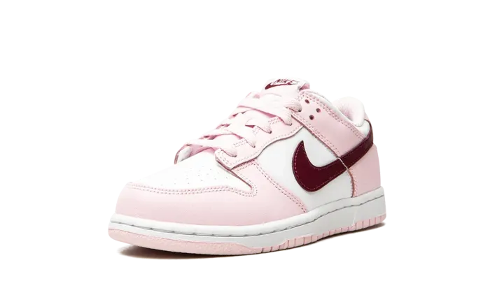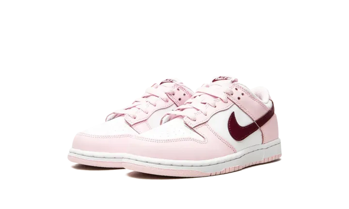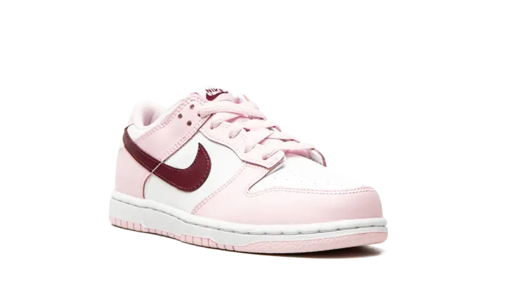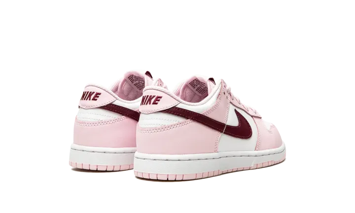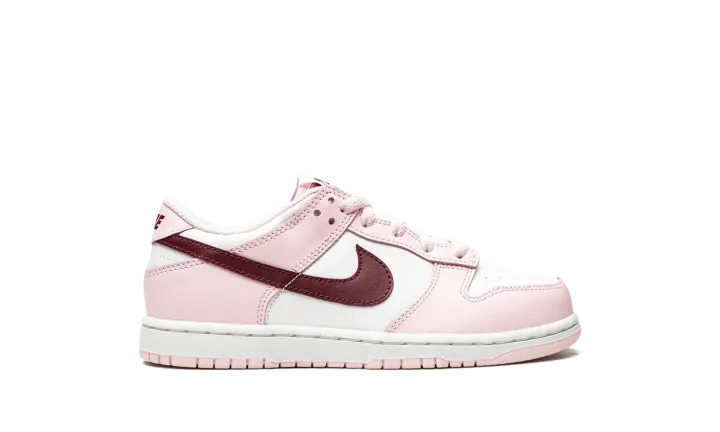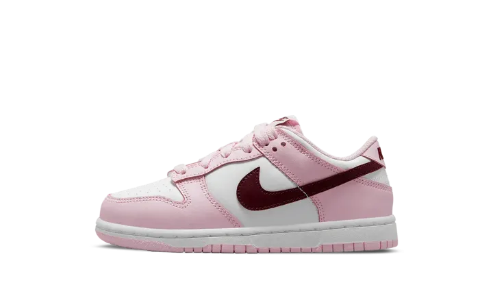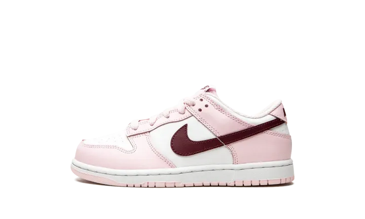 The Nike Dunk Low PS "Pink Foam" is the preschool sizing of the retro basketball shoe with eye-catching pink accents. The "Pink Foam" turns head with a white leather base contrasted with Pink Foam leather overlays. The look is broken up with Dark-Beetroot-colored leather Swoosh logos on both sides. A Dark Beetroot "Nike" logo appears on the heel and is printed on the tongue tag above a dark red Swoosh. The white midsole is paired with a pink rubber outsole.