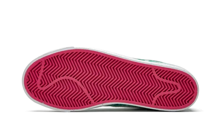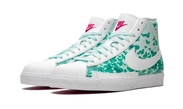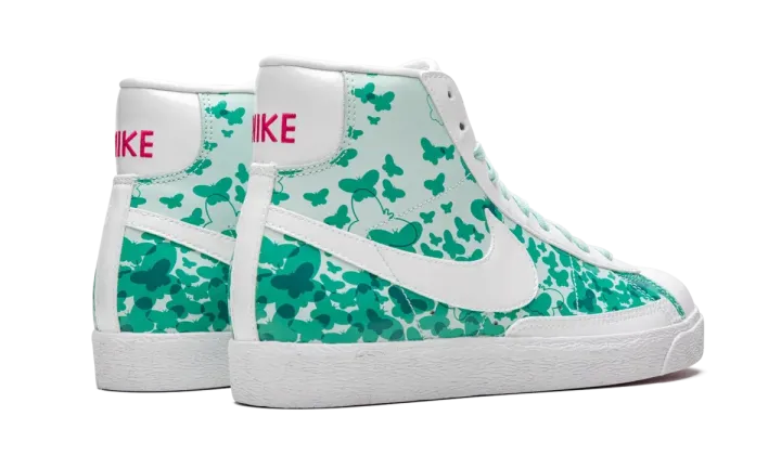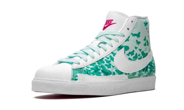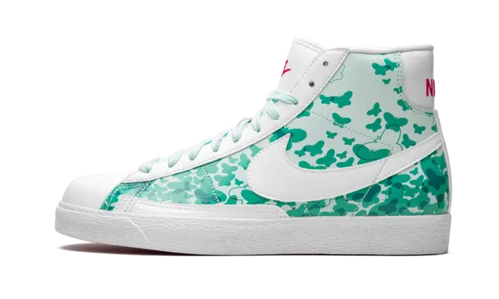 The Nike Blazer Mid Premium is a lifestyle shoe with a fanciful design made especially for girls. For the color scheme, minty green covers the laces, side, and rear panels, while white is seen on the toe, eyelets, heel, Swoosh, and lining. Retro Nike branding on the tongue and heel, are bright pink, as well as the shoe's outsole. But that's not all. Fleeting butterflies are printed all over the upper in different shades of green. The result is a whimsical aesthetic that allows girls to flaunt their confident style.