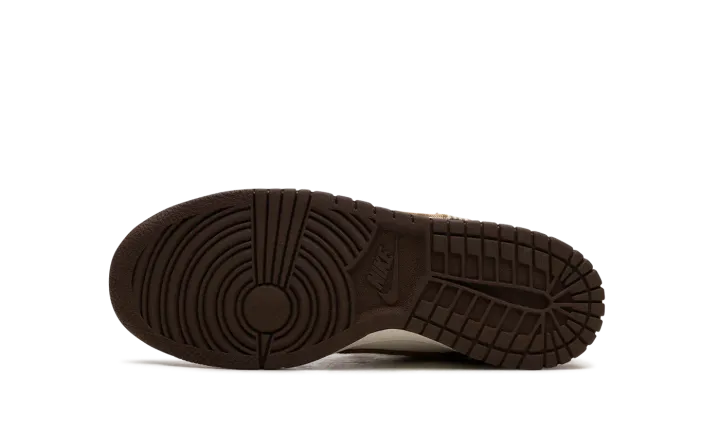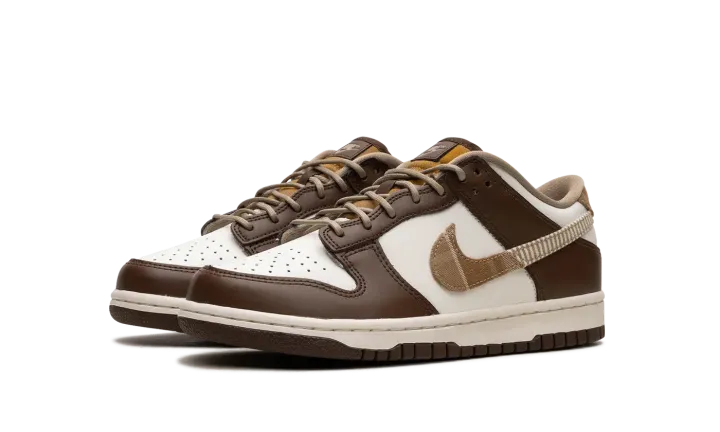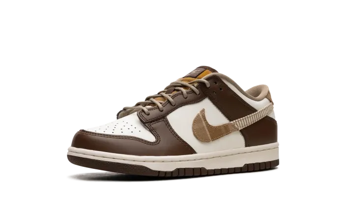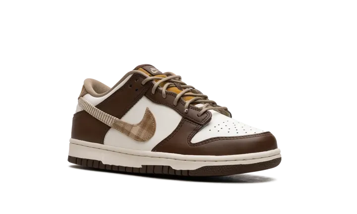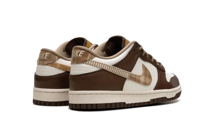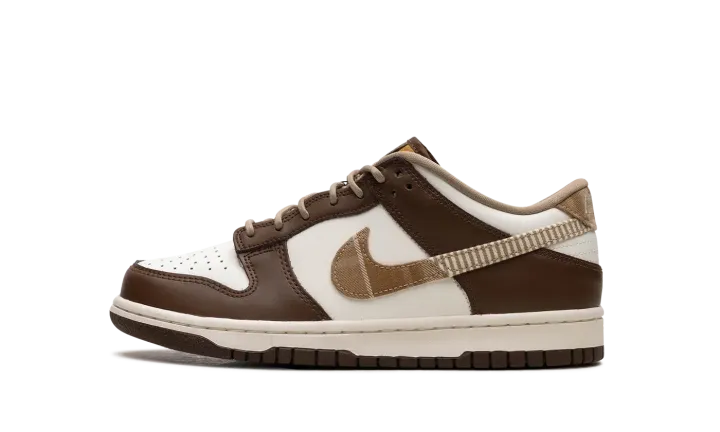 The Nike Dunk Low GS "Brown Plaid" is the youth sizing of the retro basketball shoe with a unique combination of materials in neutral colors. The upper features a Sail leather base with contrasting brown leather overlays on the toe, forefoot, eyelets, collar, and heel. A brown plaid material can be found on the Swoosh on either side of the shoe and on the heel tab. Classic "Nike" branding appears on the heel and tongue. The tongue is designed in a copper-colored corduroy material and outfitted with rope laces. Underfoot, a Sail rubber midsole gives the sneaker a vintage look. Release date: November 2023