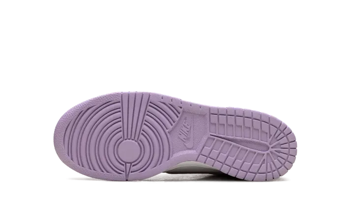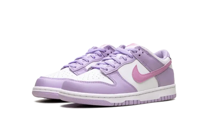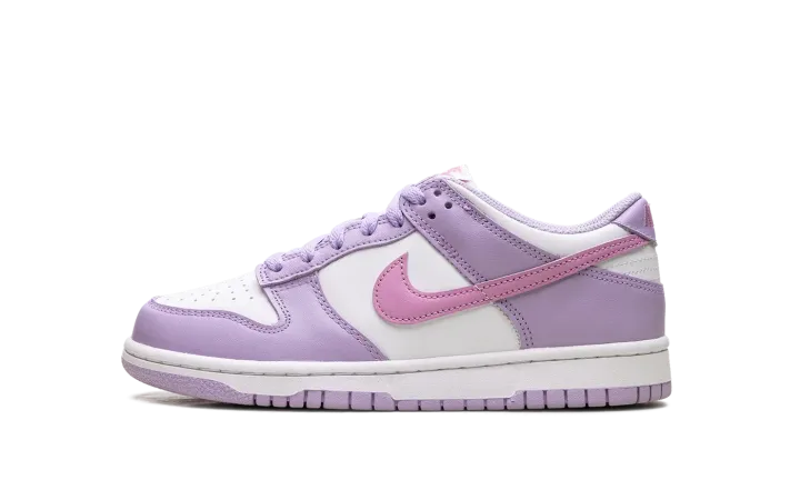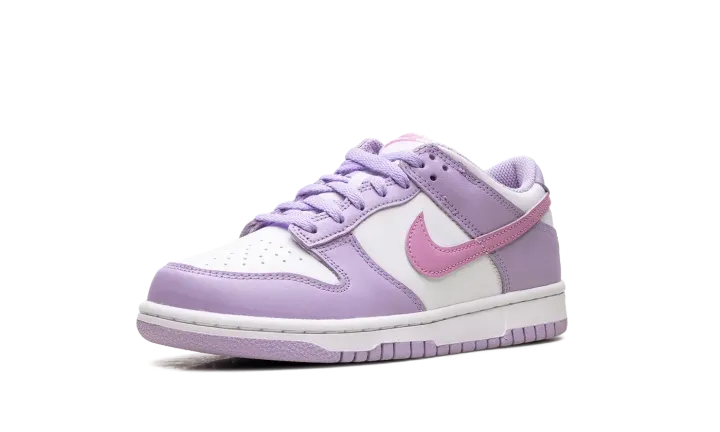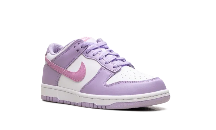 The Nike Dunk Low GS 'Lilac Bloom' rocks a crisp, white leather upper, touched with lavender overlays and a pink Swoosh.