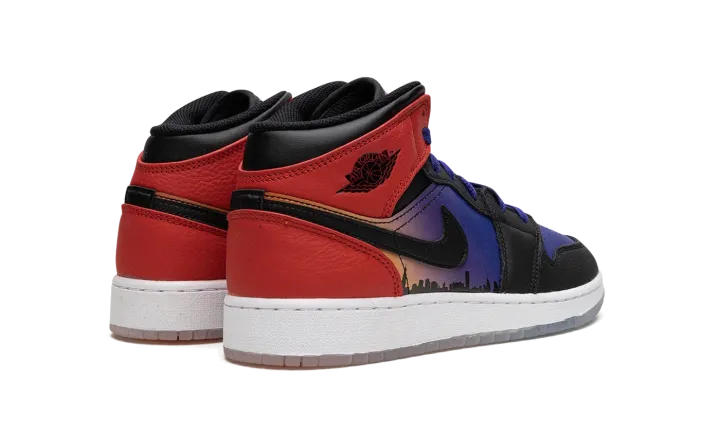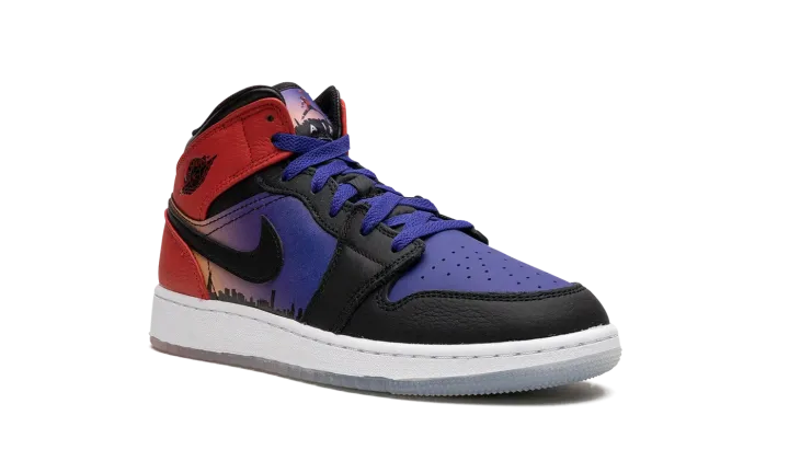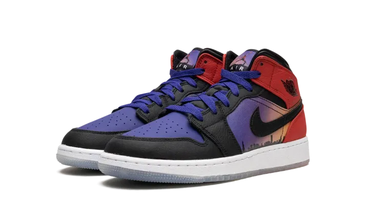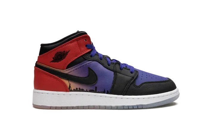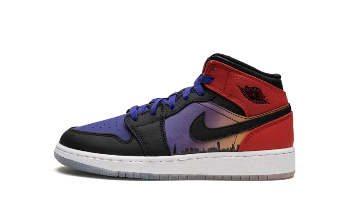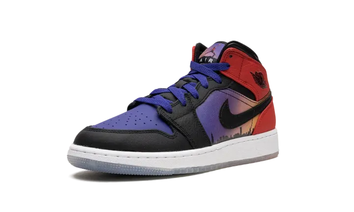 The Air Jordan 1 Mid GS "Skyline" is the youth sizing of the popular lifestyle shoe in a colorway that pays tribute to Chicago's skyline. The "Skyline" Jordan 1 Mid is inspired by Chicago's skyline, which served as the backdrop in the iconic photo of Michael Jordan dunking a basketball while doing the famous Jumpman pose. Psychic Purple leather appears on the shoe's perforated toe while contrasting black leather is found on the overlays on the toe cap, forefoot, and eyelets. Fiery University Red leather lands on the collar and heel. The highlights of the shoe are the graphic of Chicago's skyline on the mid-panel and the photo of Jordan doing the Jumpman pose on the tongue tag. A gradient purple-to-orange-to-red design is found beneath the clear rubber outsole. Release date: March 29, 2023