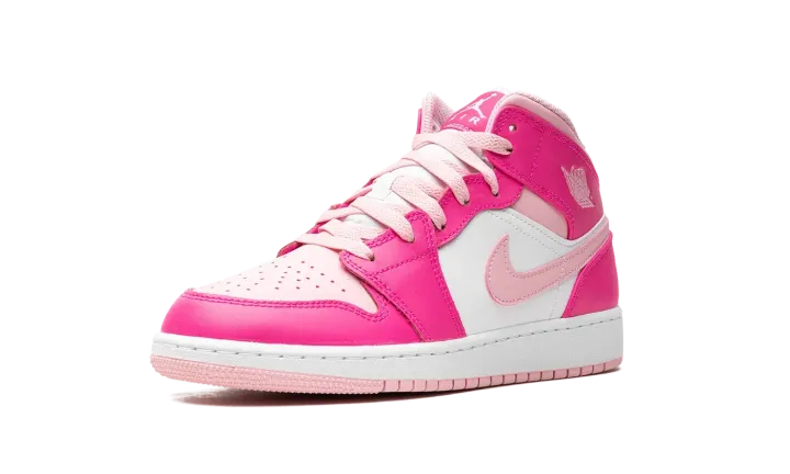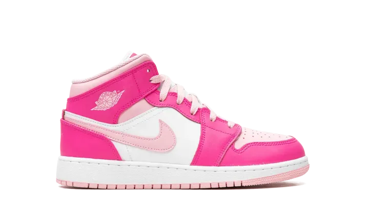 The Air Jordan 1 Mid GS "Fierce Pink" is the youth sizing of the lifestyle shoe with pink accents that give it a can't-miss look. The colorway is complete with a Medium Soft Pink leather toe with Fierce Pink leather overlays. Medium Soft Pink accenting is also seen on the leather Swoosh on the sides and on the collar. A classic "Wings" logo appears on the overlay on the collar and a Jumpman is found on the tongue. Underfoot, the white rubber midsole and pink rubber outsole put the finishing touches on the shoe's design. Release date: July 24, 2023