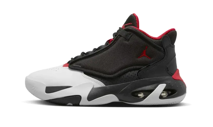 Experience the next generation of court-ready style with the Air Jordan Max Aura 4 GS "Black White Gym Red." Designed for older kids, this sleek basketball-inspired sneaker features a durable upper crafted from a mix of genuine and synthetic leathers, along with tough polyester for a pliant yet supportive feel. It ensures supreme comfort with its visible Max Air unit under the heel, providing lightweight impact cushioning. The bold Black, White, and Gym Red color scheme gives it a classic Jordan look, while the rubber outsole's futuristic wave tread pattern delivers reliable, multi-surface traction for play on the court or the street.