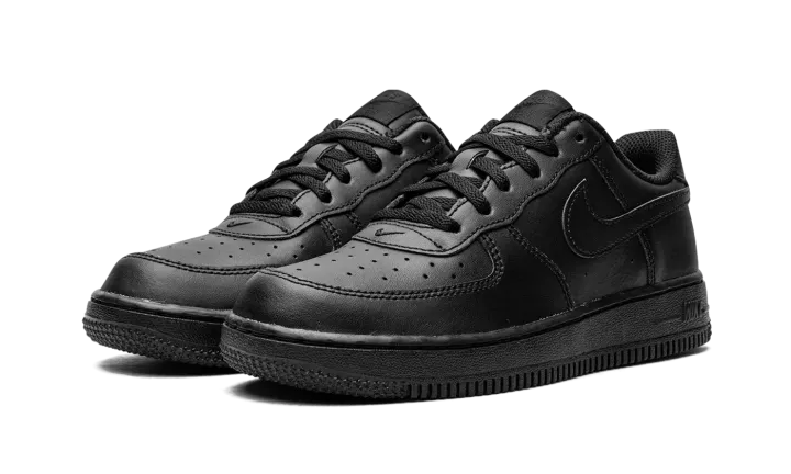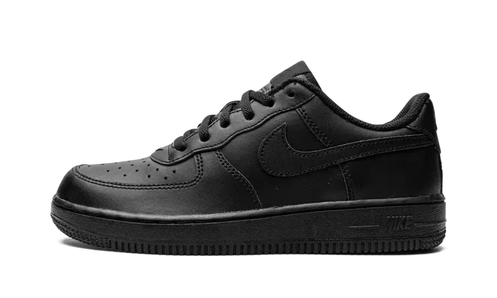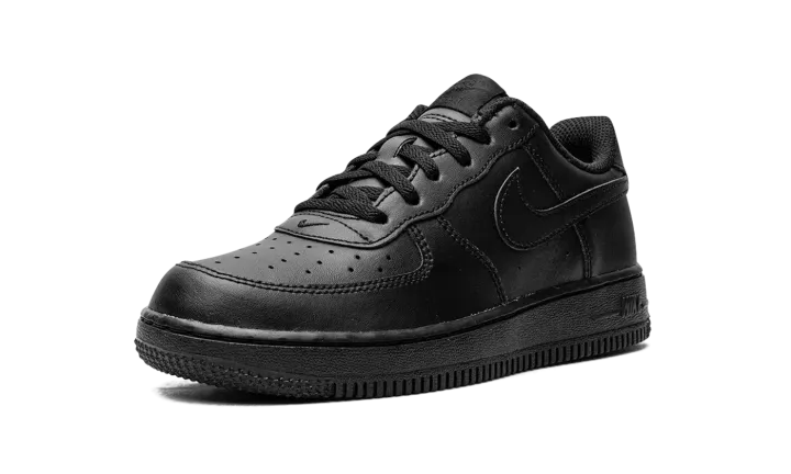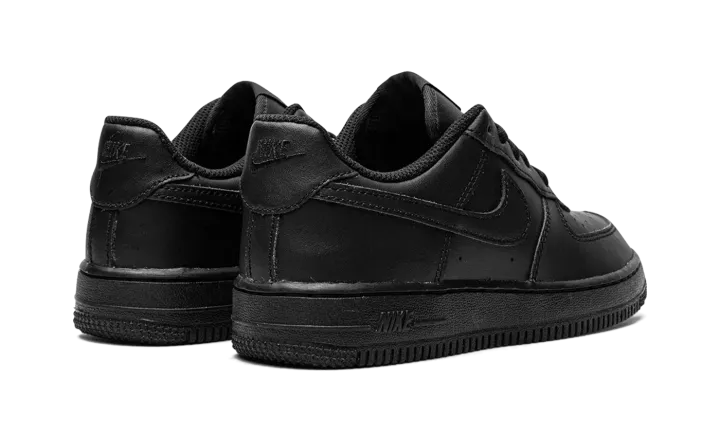 The Nike Force 1 Low PS "Triple Black" is the preschool sizing of the vintage basketball shoe in a monochromatic black colorway. The definition of versatile, the "Triple Black" colorway of the Force 1 Low for preschoolers features an all-black leather upper, including a black leather perforated toe, mid-panel, heel, and Swoosh. A tonal "Nike" logo with a Swoosh is embroidered on the heel and printed on the black nylon tongue tag. The inner lining, tongue, and laces appear in black as a continuation of the monochromatic vibe. Underfoot, a black rubber sole completes the look.