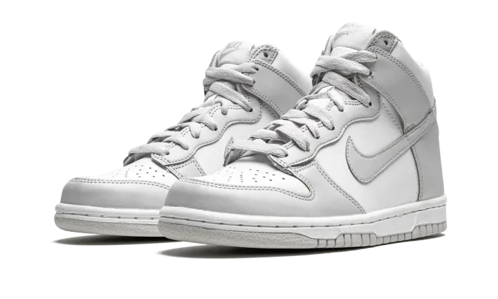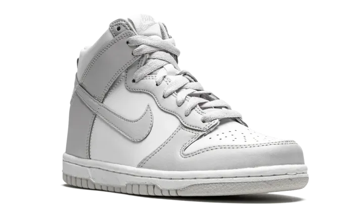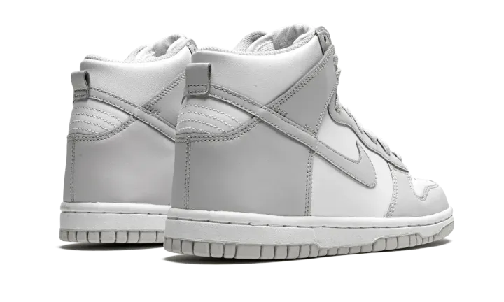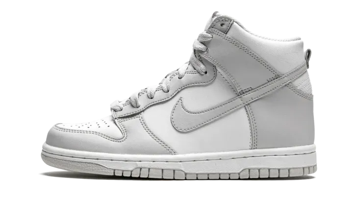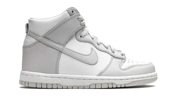 The Nike Dunk High GS "Vast Grey" is the youth sizing of the understated colorway for the venerable high-top shoe. This February 2021 colorway dubbed "Vast Grey" keeps a simple and versatile two-tone white and grey color block, a design ethos shared by some of the greatest Dunk styles of all-time. White leather forms the base of the upper, appearing on the perforated toe and the mid-panel, collar, and heel. Vast Grey leather overlays, which includes a Swoosh logo on either side of the shoe, form a low-contrast to the white leather detailing. A grey nylon branding tag is stitched onto the top of the white mesh tongue. Underfoot, the "Vast Grey" features a white midsole and grey outsole. Release date: February 25, 2021
