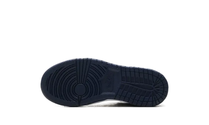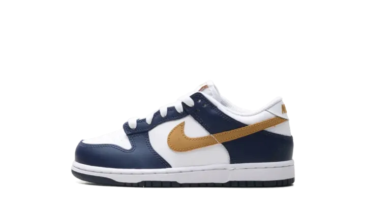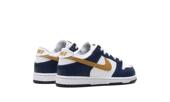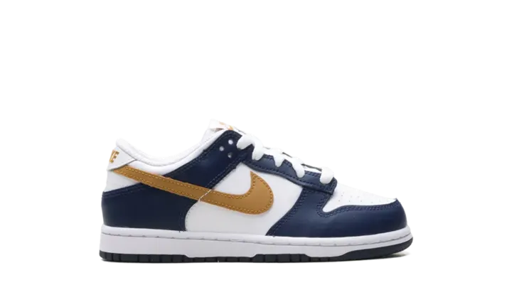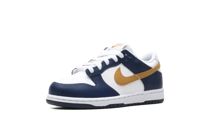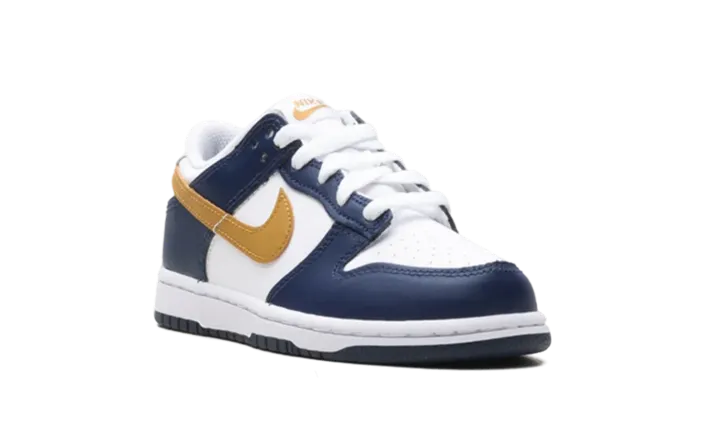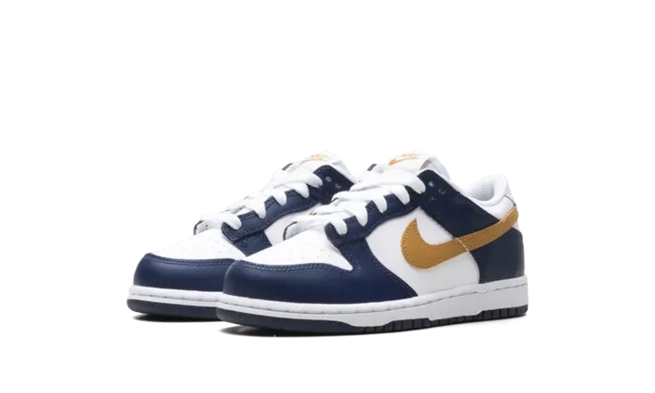 Made for little kids, the Nike Dunk Low PS 'Midnight Navy Wheat' combines a stark white leather foundation with navy overlays and a Wheat-colored Swoosh