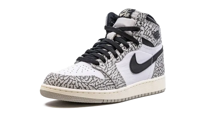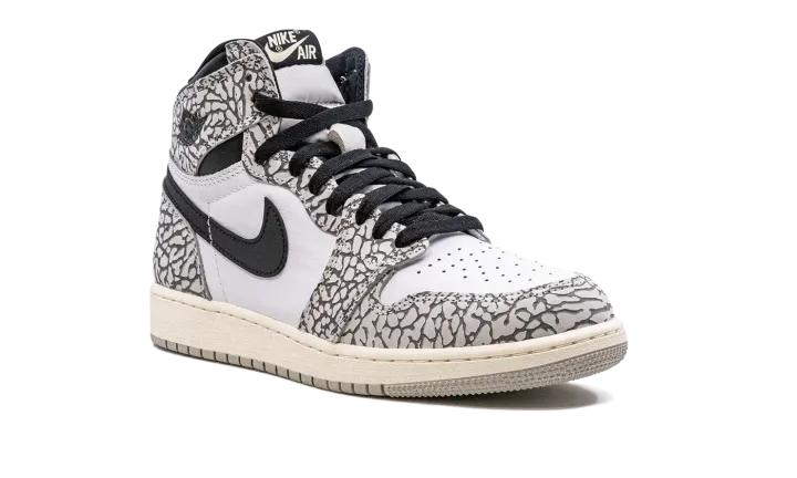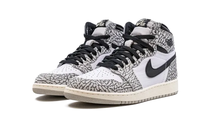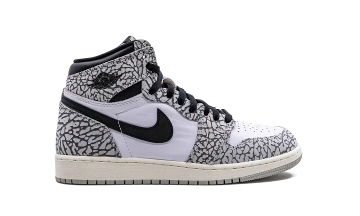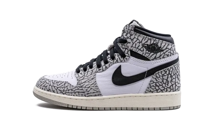 The Air Jordan 1 High OG GS "Elephant Print" is the youth sizing of the colorway of the retro basketball shoe inspired by the classic elephant patterning found on the Air Jordan 3. The "White Cement's" overlays have the same iconic elephant print that debuted on the Jordan 3 in 1988. As for the rest of the design, the shoe features a white leather base with the aforementioned Cement-colored elephant print overlays. A black Swoosh is located on either side of the shoe. A black "Wings" logo is located on the collar and white "Nike Air" detailing appears on the tongue tag. Underfoot, the vintage-inspired Sail rubber midsole is paired with a grey outsole.