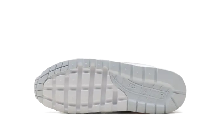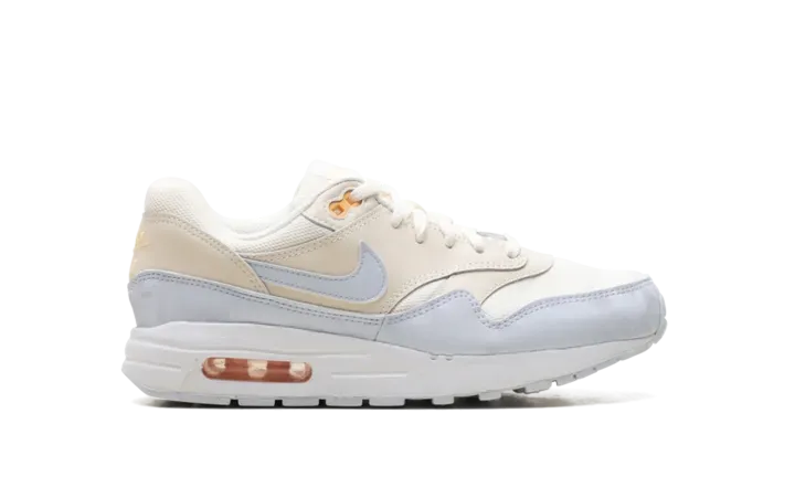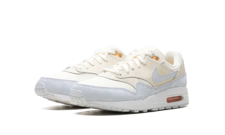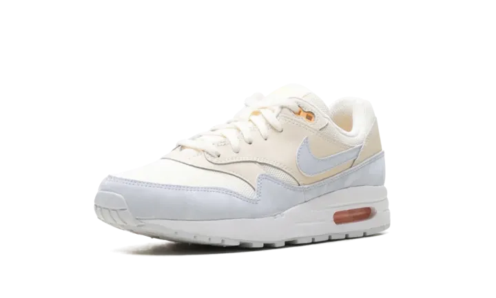 The Nike Air Max 1 GS "Pale Ivory/Football Grey" is a kids version of the retro running shoe with an easy-on-the-eyes appearance. The upper features a Pale Ivory mesh base with tonal leather overlays on the toe and mid-panel. A Football Grey leather Swoosh appears on either side of the shoe, matching the hue of the leather mudguard. "Nike Air" branding is embroidered on the heel and an orange "Nike" logo is paired with a Swoosh on the tongue tag. A visible Air unit in the heel of the white foam midsole completes the look. Release date: September 26, 2023
