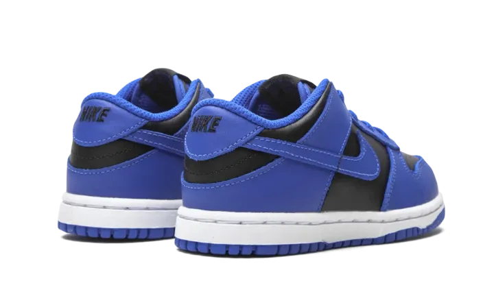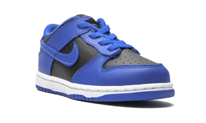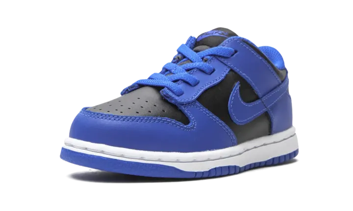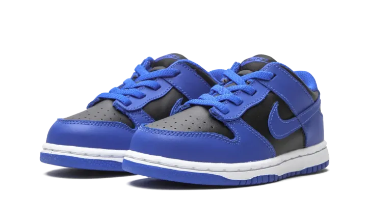 The Nike Dunk Low TD "Hyper Cobalt" is the toddler sizing of the two-tone colorway that was released by Nike in February 2021. The look mimics the two-tone colorblock of early Dunk models that were part of 1985's "Be True to Your School" collection, with black leather appearing on the perforated toe and on the mid-panel, collar, and heel. Hyper Cobalt leather overlays add a burst of color against the neutral base. The same shade of blue can be found on the Swoosh branding on either side and on the liner and laces. On the heel, black "Nike" embroidery adds a retro touch. Release date: February 18, 2021.