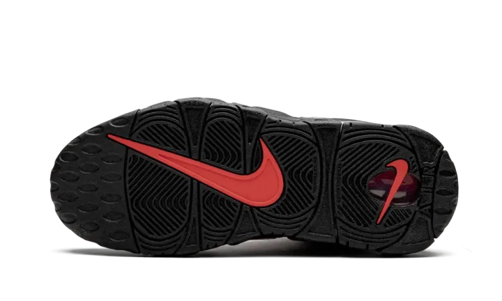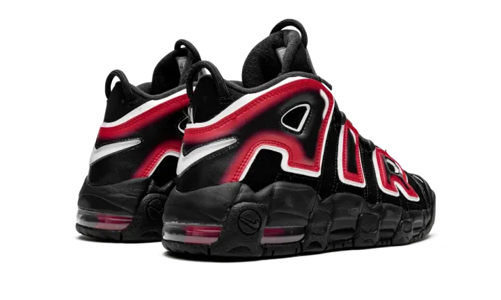 The Nike Air More Uptempo serves up a grade school sneaker with an eye-catching color combination, one that especially appeals to basketball fans. The big kids' high-top sneaker is crafted with suede, mesh, and leather materials. Black covers the upper and sole of the shoe, while a gigantic "AIR" design drapes over the entire upper. The letters are designed in a graffiti style with black at the center, red surrounding the black, and white trim along the outside. The sole is cushioned with a Nike Air unit.