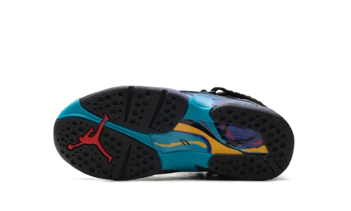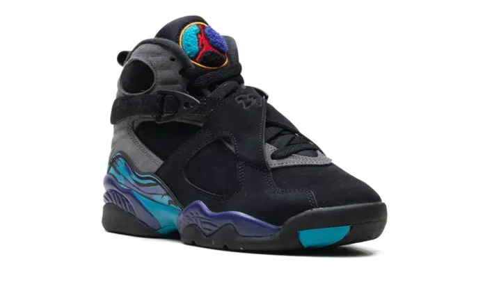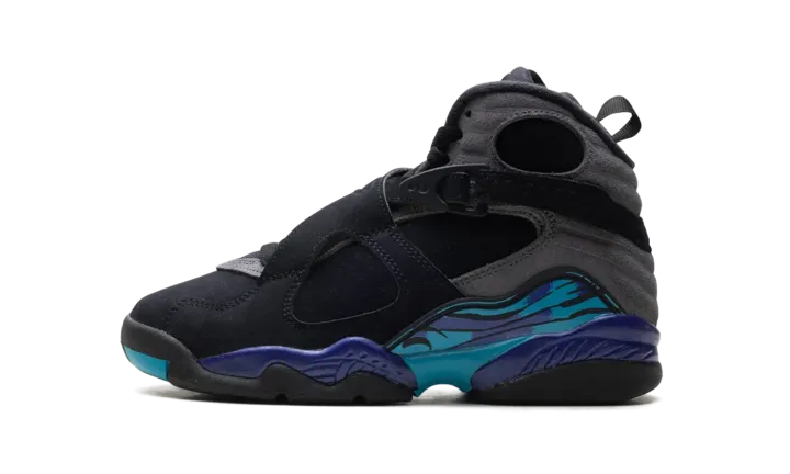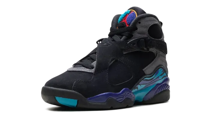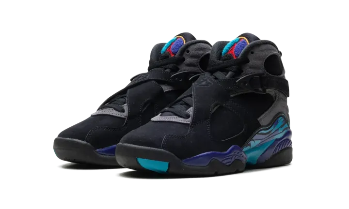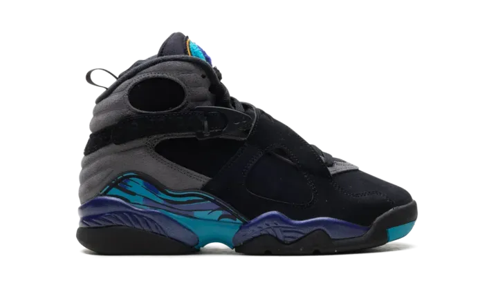 Step into a vibrant throwback with the Air Jordan 8 Retro GS "Aqua". This celebrated shoe for grade schoolers features the original black, aqua, and purple color scheme. Its unique crossover strap system ensures a supportive fit, blending heritage design with fun style. Enjoy comfortable Air cushioning, perfect for making a bold statement at school or play.