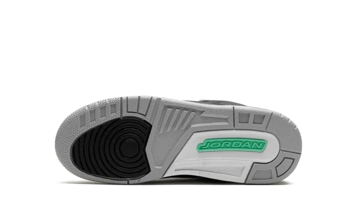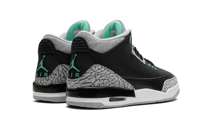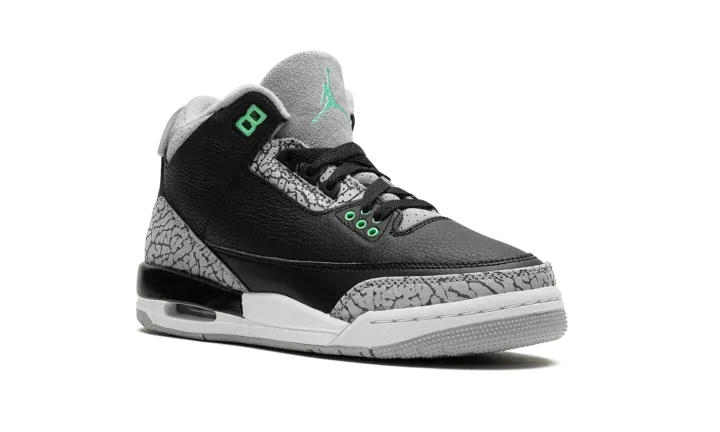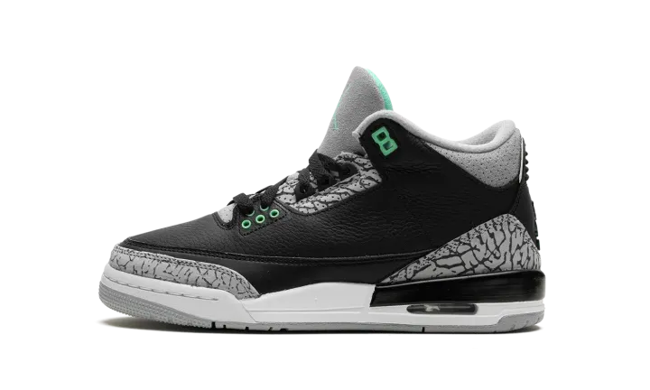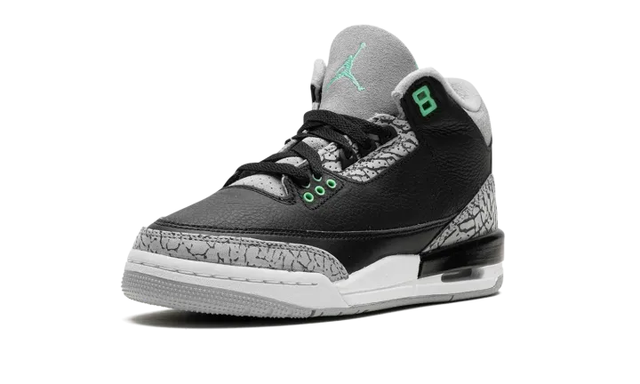The Air Jordan 3 GS "Green Glow" is the youth sizing of the retro basketball shoe loosely inspired by the model's original "Black Cement" style, but with a few changes. Like the Jordan 3 "Black Cement," the "Green Glow" features a black leather upper and grey elephant print details, but with light green accenting instead of the red accenting found on the "Black Cement." Specifically, Green Glow accenting appears on the eyelets, on the Jumpman branding on the tongue and heel, and on the "Jordan" logo on the outsole. A black painted mudguard appears on the heel above the white midsole. A small visible Air unit in the heel of the midsole gives the "Green Glow" a classic Jordan 3 look.