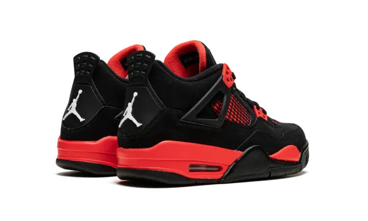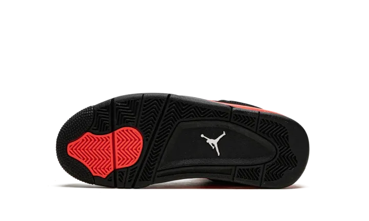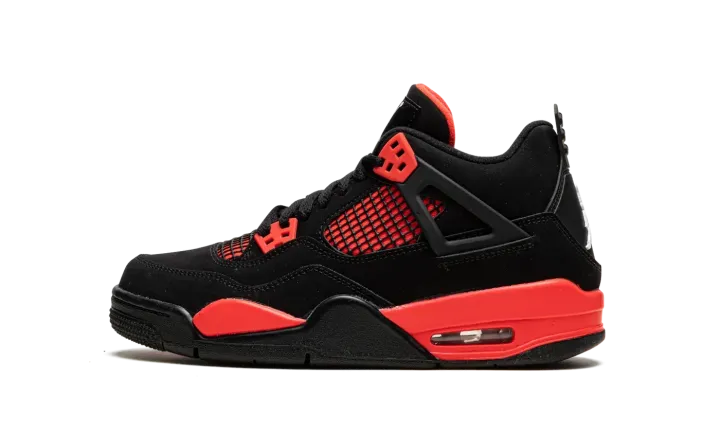 The Air Jordan 4 GS "Red Thunder" is the kids version of the colorway of Michael Jordan's fourth signature model that is inspired by a classic, non-original release of the vintage basketball shoe. The shoe we're referring to is the Air Jordan 4's "Thunder" colorway that debuted along with the popular "Lightning" colorway in 2006 before later returning as a standalone release in 2012. The "Red Thunder," as implied by its name, is styled similarly to the original "Thunder," but trades Tour Yellow accenting for red. The upper features a black synthetic nubuck base with red "wings" and a red mid-panel contrasted with black netting. The look is repeated on the tongue. Additional red detailing comes into play on the underside of the tongue, on the painted midsole, and on the "Flight" branding in script beneath the white Jumpman on the black nylon tongue tag. A white Jumpman appears on the heel. Finishing touches include a small visible Air unit in the heel of the midsole and a black rubber outsole. Release date: January 15, 2022