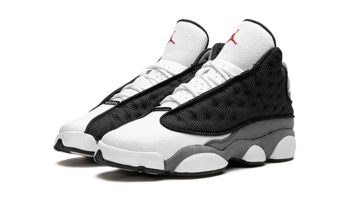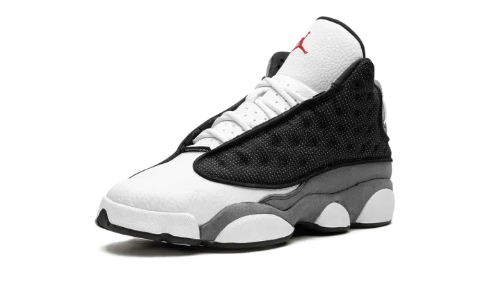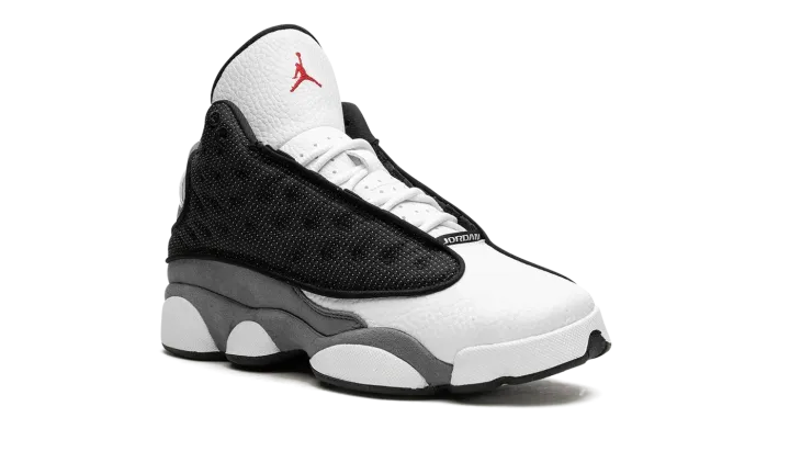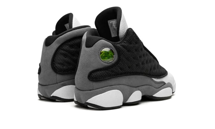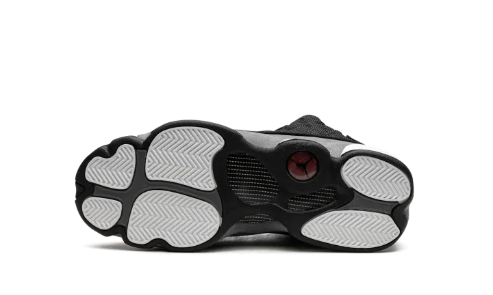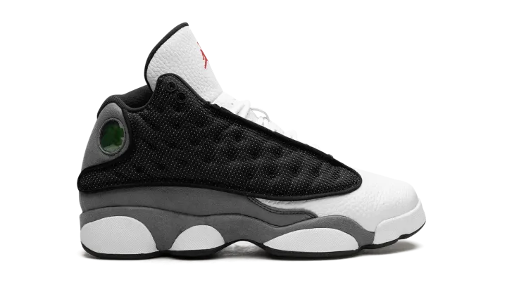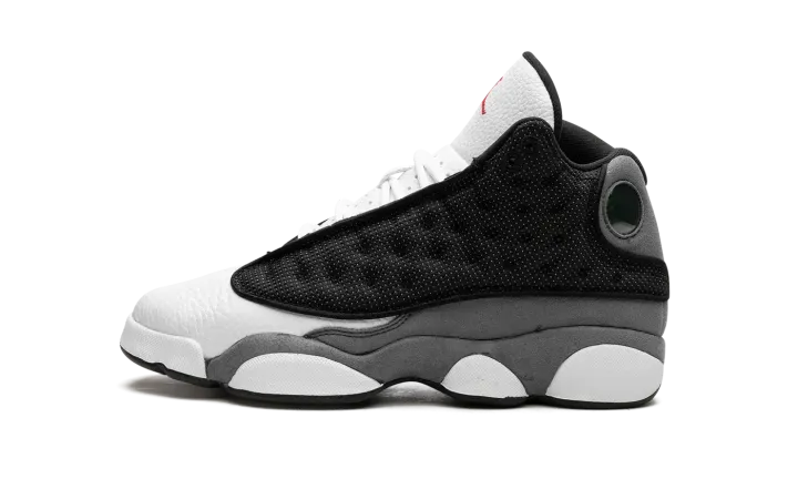 The Air Jordan 13 GS "Black Flint" is the youth sizing for the colorway of the vintage basketball shoe that is loosely inspired by one of the model's original releases. The shoe in question is the Jordan 13 "Flint," which debuted in 1998 and is one of the most popular colorways of Michael Jordan's thirteenth signature shoe. On the "Black Flint," the shoe features the same color block as its predecessor, albeit in different colors. The design is complete with a black mesh upper that's contrasted with grey suede overlays and a white leather toe. A holographic jewel appears on the lateral side of the collar. Classic Jumpman branding is found on the toe. Black rubber pods appear on the outsole mirroring that of a panther's paw, which the original Air Jordan 13 was inspired by. Release date: April 22, 2023