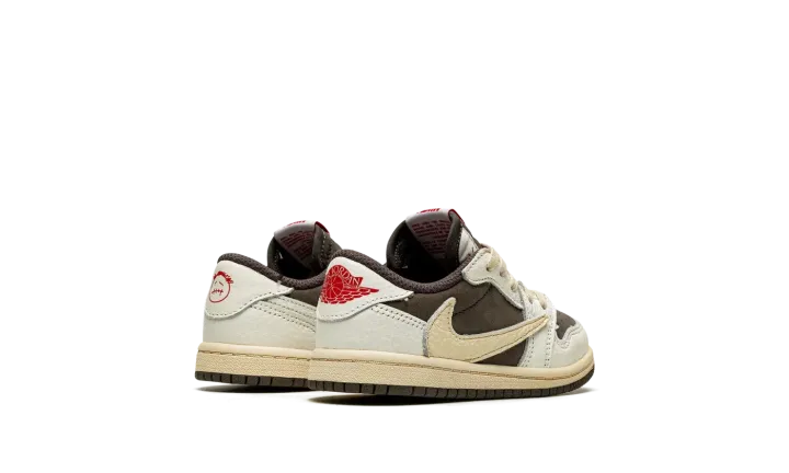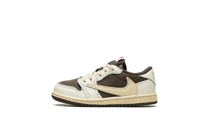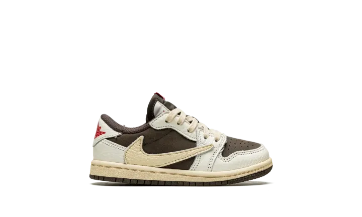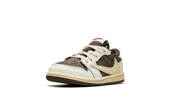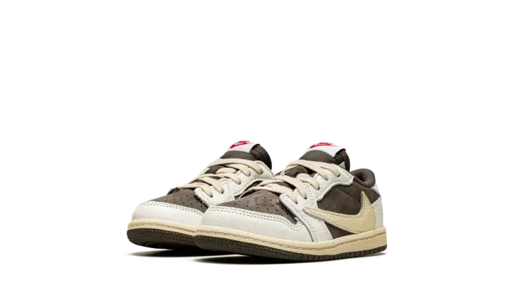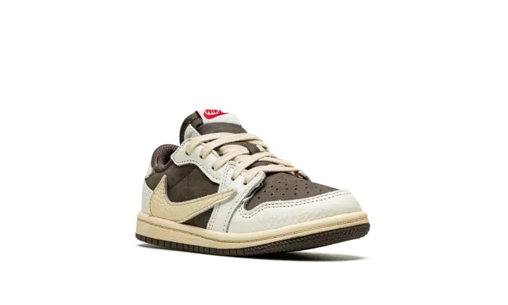 Let your little one rock the iconic style of the Travis Scott x Air Jordan 1 Low "Reverse Mocha" TD. This toddler shoe "reverses" the color blocking of the original collaboration, bringing a fresh twist to a classic design. Mocha nubuck covers the perforated toe, mid-panel, and collar, while white leather overlays add a crisp contrast. The signature backwards Swoosh, a hallmark of Travis Scott's designs, appears in cream on the sides. A red smiley face logo is embroidered on the left heel, and a red "Wings" logo adorns the right. These stylish toddler sneakers bring big style to little feet.