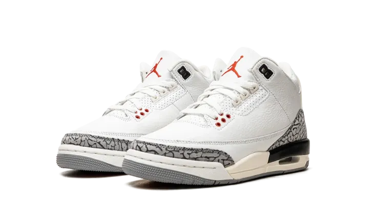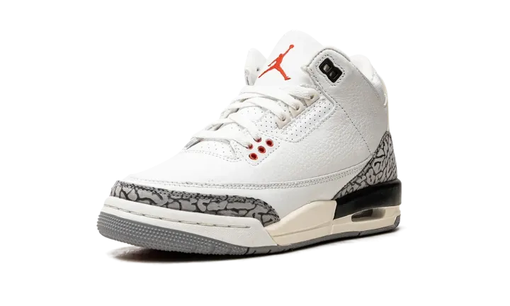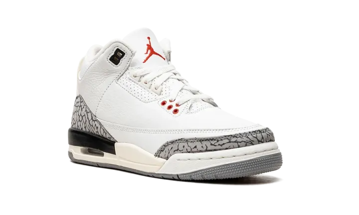 The Air Jordan 3 GS "White Cement Reimagined" is the youth sizing of the special version of the vintage basketball sneaker that replicates its original design. Released in 2023 to celebrate the iconic Jordan 3's 35th anniversary, the "White Cement Reimagined" retains the look of the model's "White Cement" colorway with accurate-to-original panels, colors, and overall shape. Faithful to the 1988 version of the Jordan 3 "White Cement," the "Reimagined" features a higher-cut ankle collar inspired by the OG Jordan 3's design. It also is equipped with a white leather upper with contrasting grey elephant print on the toe and heel, which has also been modified to look like the detailing on the original Jordan 3. The "Nike Air" branded heel counter has an aged, vintage look, as does the midsole. Release date: March 11, 2023