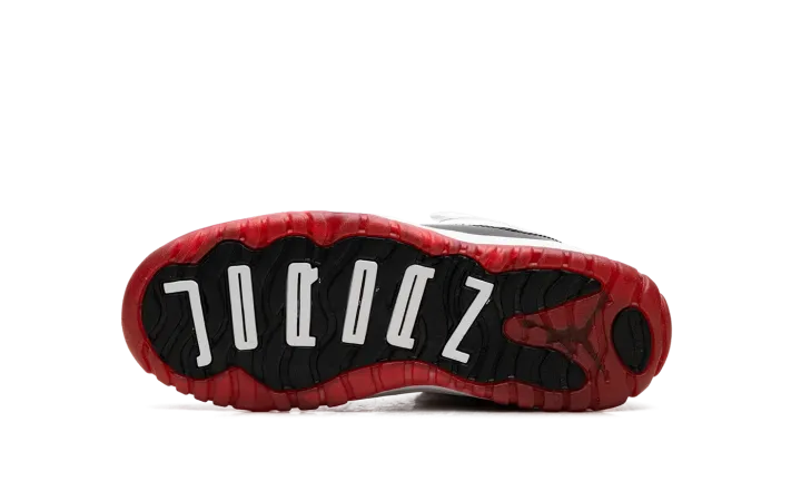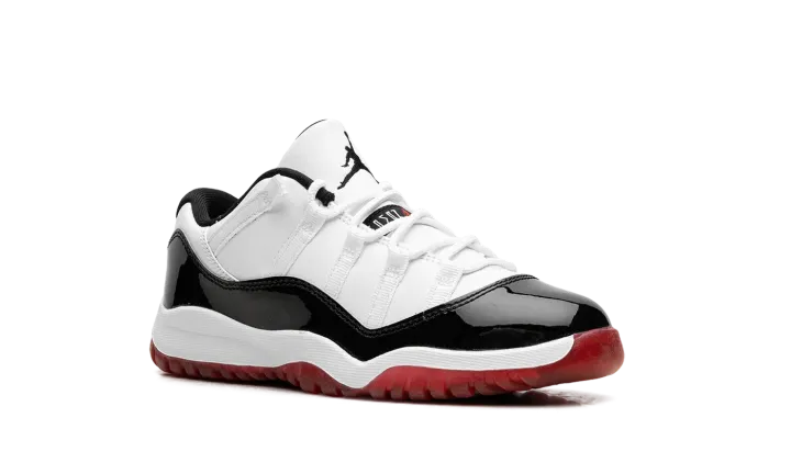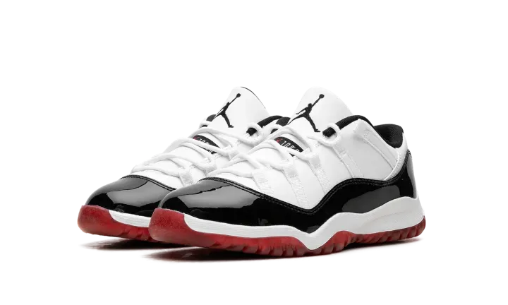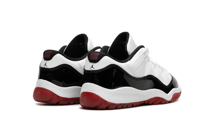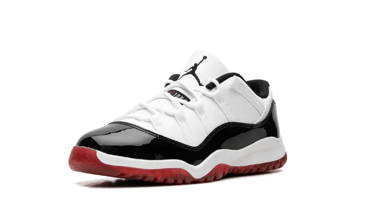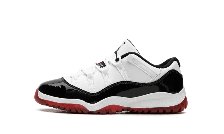 The Air Jordan 11 Low PS "Concord Bred" is the preschool sizing of the low-top silhouette that graciously combines two legendary colorways. Both the "Concord" and "Bred" designs were worn by Michael Jordan during the 1995-1996 NBA season in which Jordan played a hand in helping the Chicago Bulls achieve a then-record 72 regular season wins. Now, the two easy to wear looks appear side-by-side on this Jordan 11 Low. The upper displays a white leather construction on the mid-panel and collar. The white upper and black patent leather mudguard is reminiscent of the "Concord" look. A contrasting white midsole and semi-translucent University Red outsole combines with the aforementioned black patent leather and white midsole to mirror the Jordan 11 "Bred" colorway.
