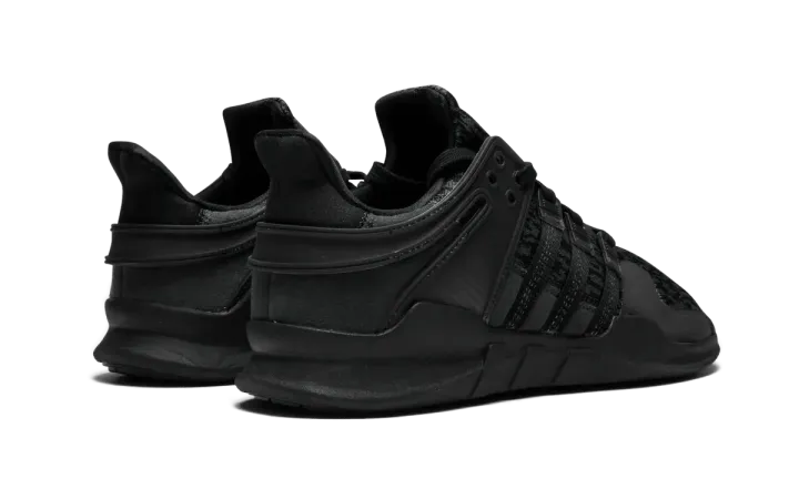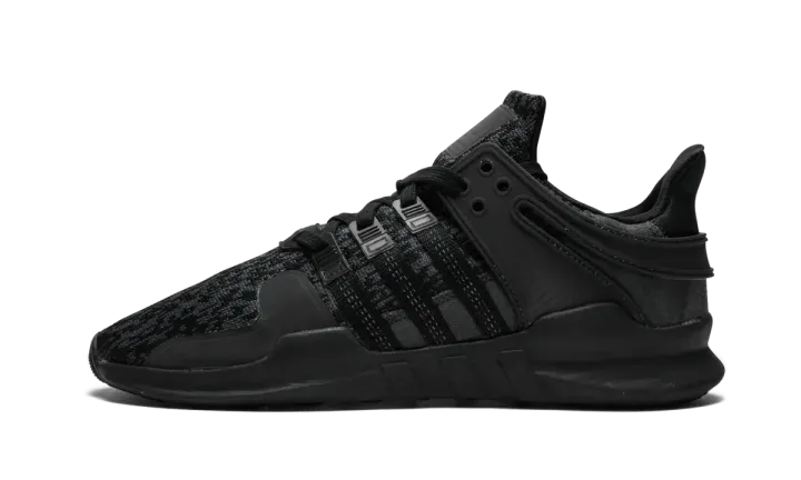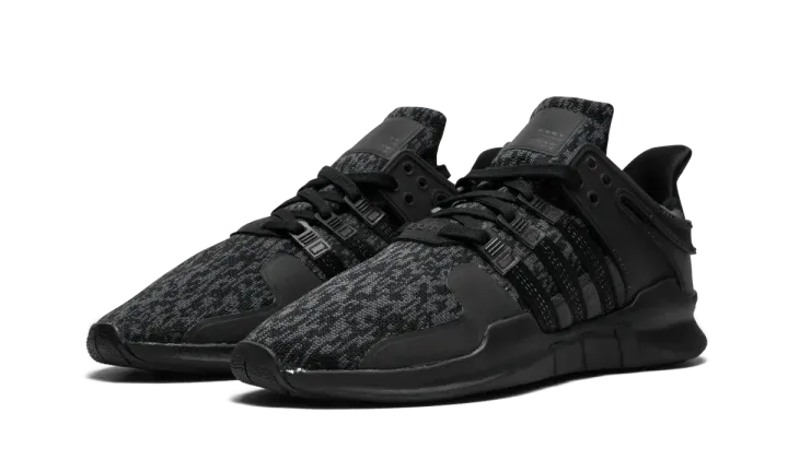 This adidas EQT Support ADV released in 2017 and is a brand new shoe inspired by the adidas EQT training line from the '90s. The pair brings the design into the 21st century with a Primeknit upper and sock-like ankle collar. TPU underlays in the heel provide extra support. Details borrowed from the original adidas EQT sneakers include nylon Three Stripes branding on each side panel that double as eyelets, the logo stamped on the tongue, and an EVA midsole. This particular colorway features a black pixel-knit upper with black detailing.