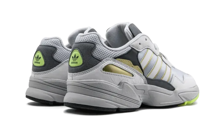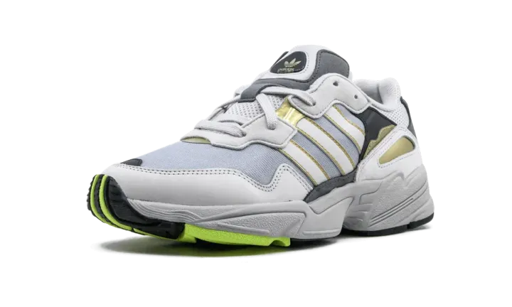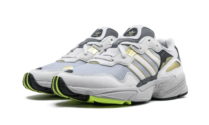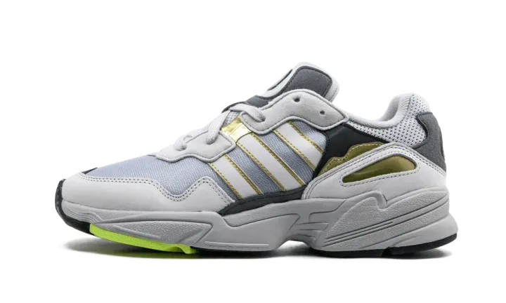 The Adidas Yung-96 combines vibrant '90s nostalgia with a contemporary flair. Drawing from archival designs, the Yung-96 fuses new materials with a vintage runner look for the streets. A flexible mesh upper is layered with grey nubuck around the toe and midsole. Adidas's chunky and very much omnipresent EVA foam sole ensures maximum all-day comfort. Familiar white and gold outlined three-stripes branding is on the upper, navy blue suede patches feature green adidas branding on the heel, and gold accents pop along the side panels. The adidas Yung-96 released on August 30th, 2018.