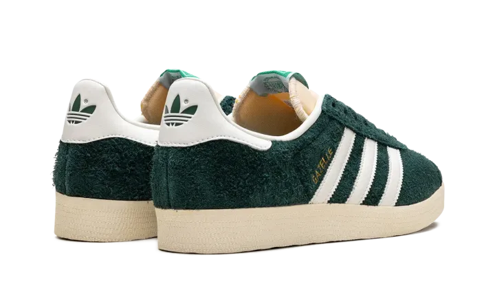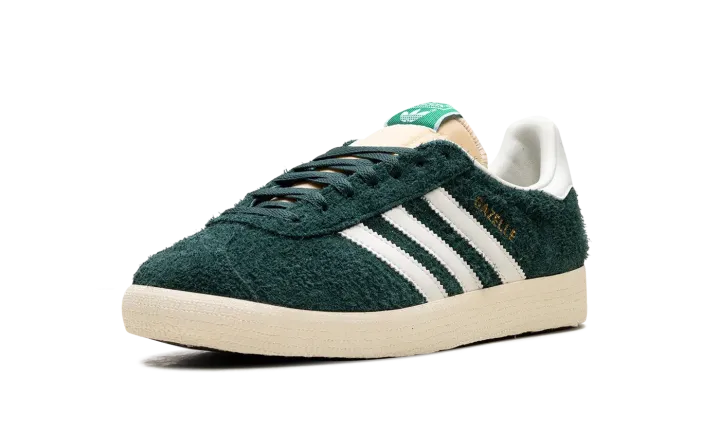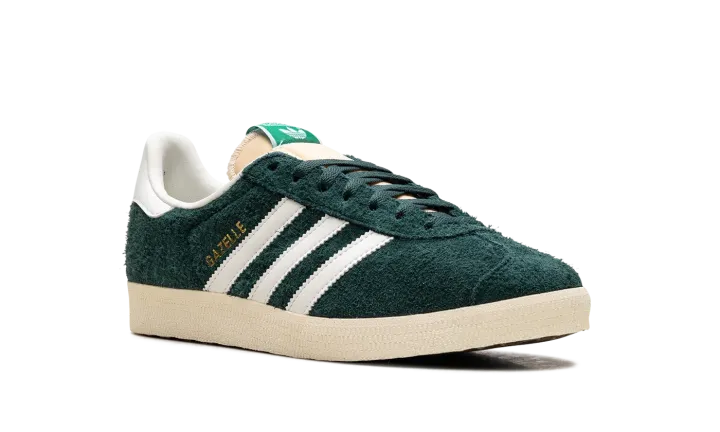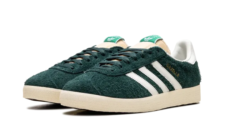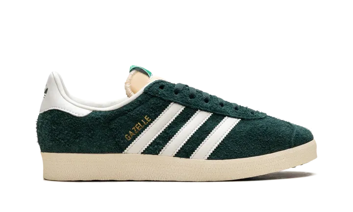 Walk in the footsteps of history with the Adidas Gazelle, an indoor classic redefined in the elegant "Mineral Green" colorway. This timeless icon honors the beloved 1991 version with a plush and supple suede upper and signature serrated 3-Stripes in contrasting off-white. The low-profile silhouette features an iconic T-toe and is grounded by a traditional rubber outsole, offering dependable grip. The eye-catching colors and gold foil 'Gazelle' lettering lend modern style to this retro favorite.
