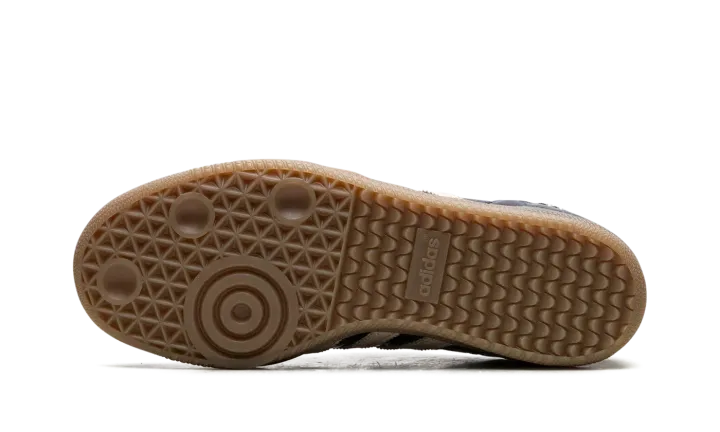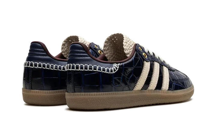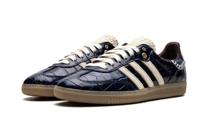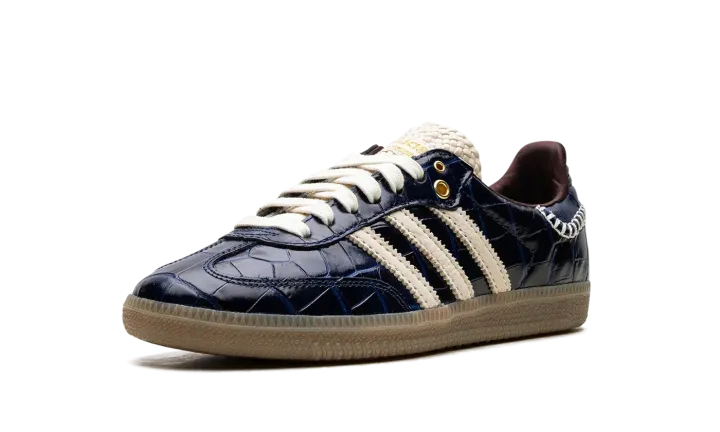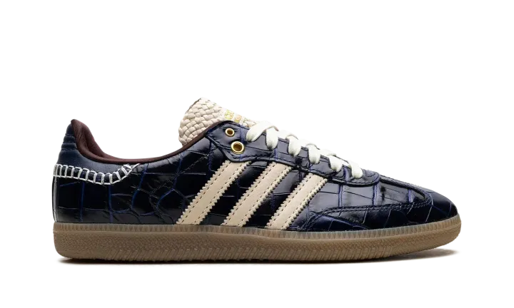 The adidas Samba Wales Bonner "Navy Croc" elevates the classic Samba with a luxurious touch. Navy croc-embossed leather defines the upper, adding texture and depth. Cream three stripes and heel tab provide vintage contrast. Hand-stitched detailing along the midsole showcases Bonner's craftsmanship. A gum rubber sole balances retro and modern aesthetics. This collaboration blends sport and high fashion, embodying Wales Bonner's signature cultural fusion. The "Navy Croc" Samba is a standout piece, merging iconic design with artisanal details, appealing to both sneaker and fashion collectors.