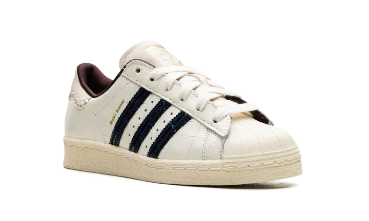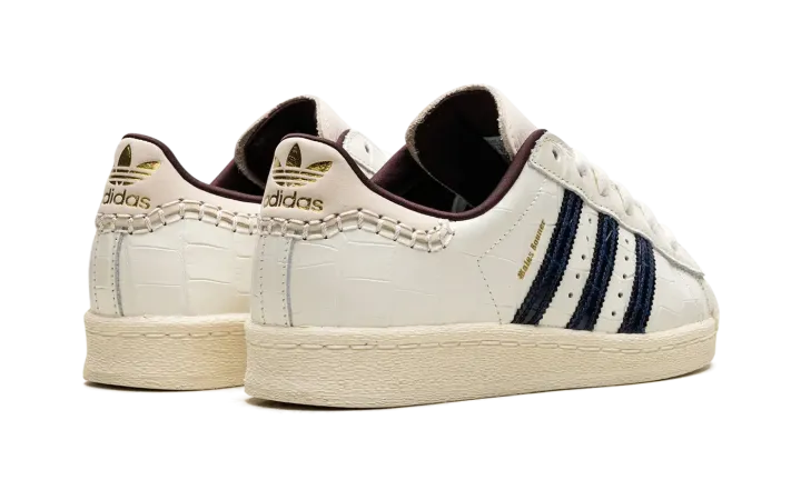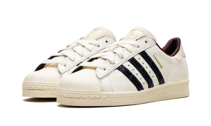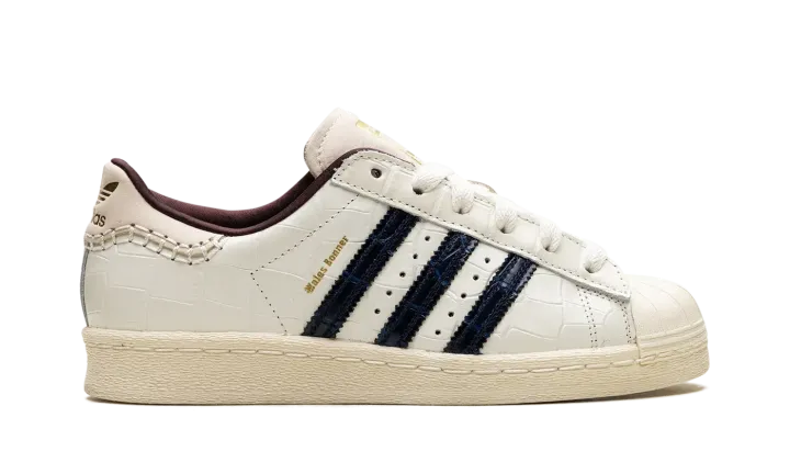 The Superstar 'Wales Bonner - White Croc' shoe blends classic Adidas Superstar style with a unique croc-embossed design, offering a sophisticated and distinctive look.