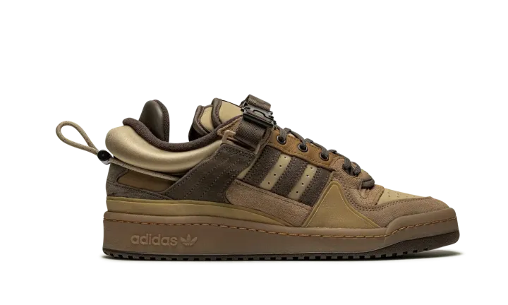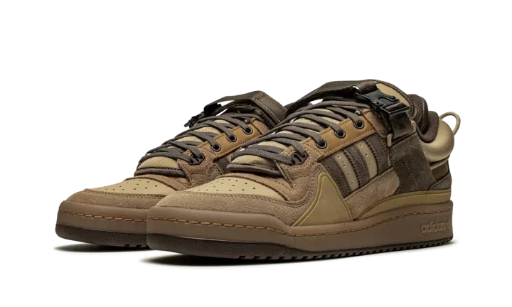 The Bad Bunny x adidas Forum Low Buckle "The First Cafe" is the first-ever collaboration between the Grammy Award winning recording artist and adidas on the retro performance basketball shoe. A March 2021 release, the "The First Cafe" is nicknamed and stylistically inspired by Bad Bunny's appreciation for a morning cup of coffee. A combination of suede and leather panels in various mocha hues adorn the forefoot, toe, collar, and heel. The model's signature Three Stripes detailing is finished off in dark brown suede matched by overlays on the lateral side of the heel. A plush java leather construction forms the base of the shoe. Two unique, overlapping and interchangeable tongues allow the wearer to customize the look. A brown nylon ankle strap with "YO VISTO ASI," which translates to "I dress like this" from Spanish, is embroidered under the strap. A lace toggle and double heel design on the back of the shoe enhance the upscale vibe of Bad Bunny's debut adidas collaboration. Release date: March 16, 2021.