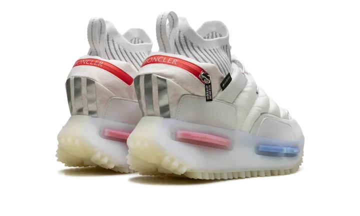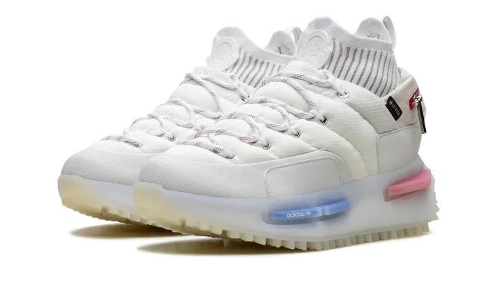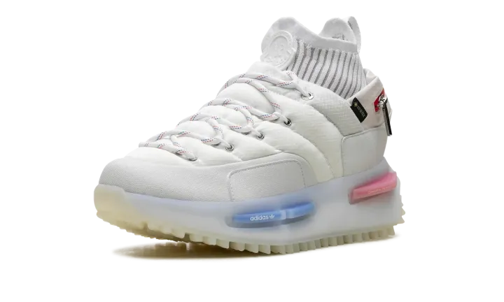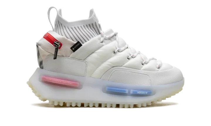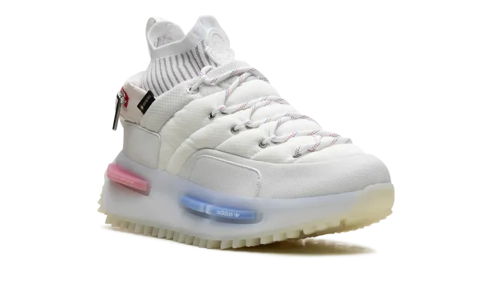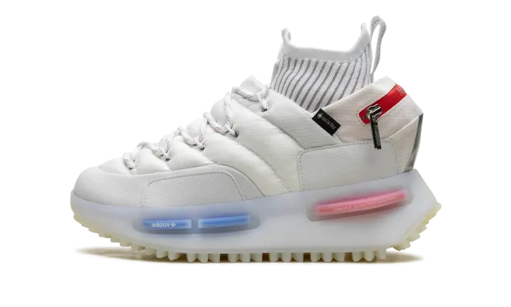 The Moncler x adidas NMD Runner "Core White" is a collaboration by the Italian high fashion brand on a decidedly modern version of the lifestyle shoe. Designed through the lens of Moncler, the luxury fashion house that specializes in performance outerwear, the NMD Runner is part of a collection of sneakers and apparel by Moncler and adidas. The upper features a white padded ripstop construction made with water-resistant Gore-Tex material. A lace-up drawstring is inspired by Moncler's mountaineering roots, and a zippered pouch at the heel makes this sneaker function even more like a winter parka for your feet. The sock-like collar provides a comfortable fit while retailing warmth. Underfoot, the exaggerated midsole gives the shoe a contemporary appearance while the lugged outsole ensures traction on a variety of surfaces. Release date: October 4, 2023