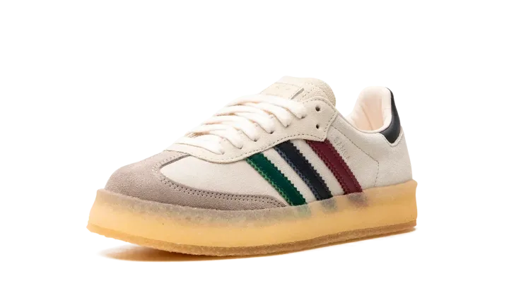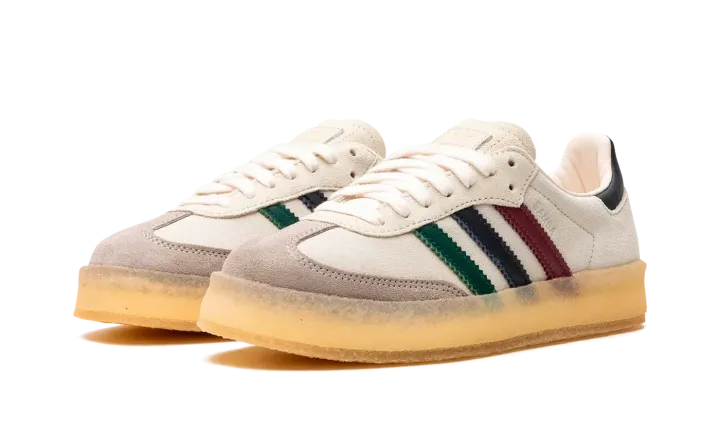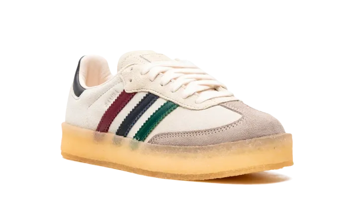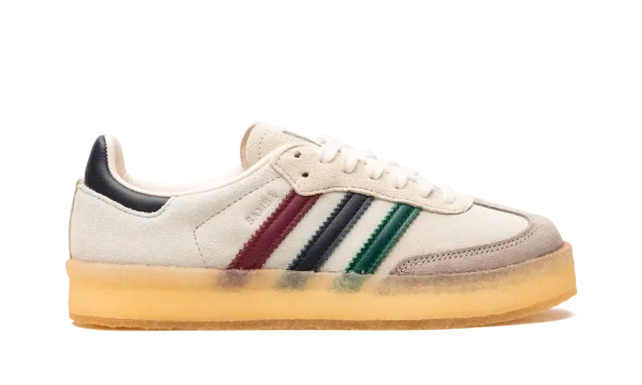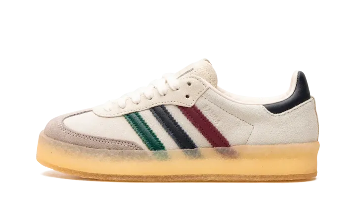 The Kith x Clarks x adidas 8th Street Samba "Kithmas" is a three-way collaboration between the New York based retailer, the heritage footwear company, and adidas on a colorway of the classic shoe with a Christmas-inspired theme. A collaboration that brings together three of the most respected names in footwear, the adidas 8th Street Samba co-designed by Ronnie Fieg and Clarks features elements of the adidas Samba mixed with the recognizable Clarks crepe sole. More specifically, the upper has an off-white-colored suede design and green, black, and burgundy leather Three Stripes branding on both sides. A "Samba" logo can be found on the lateral side of the shoe and a co-branded patch is seen on the tongue. Underfoot, a semi-translucent crepe sole completes the look. Release date: December 25, 2023