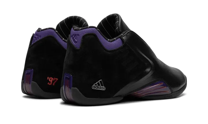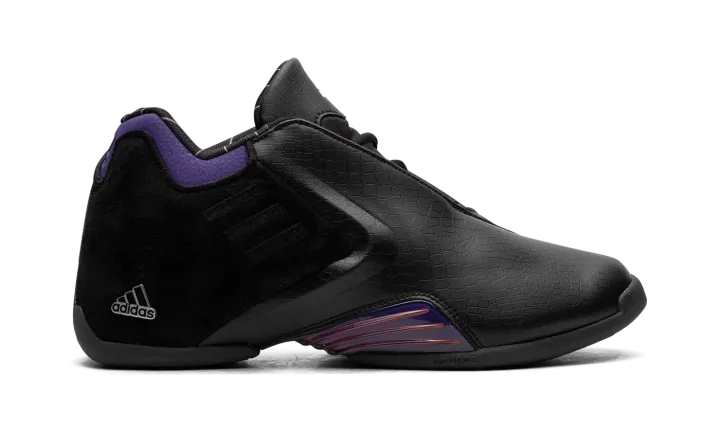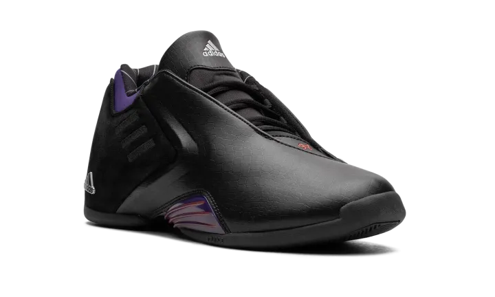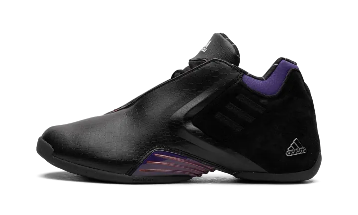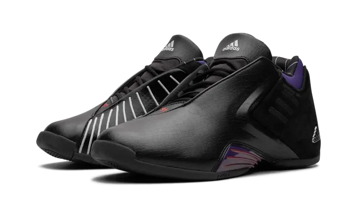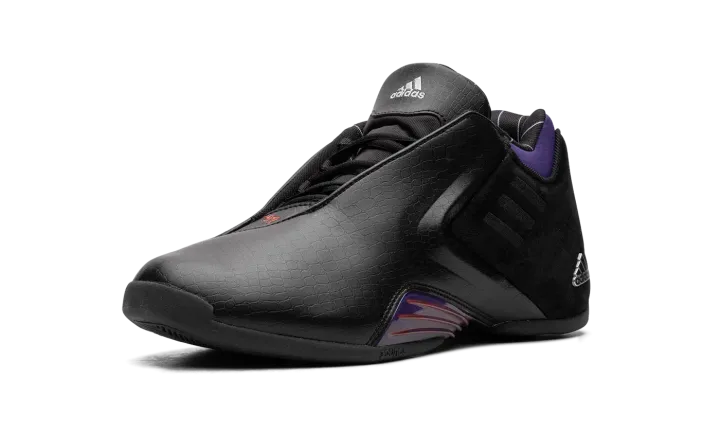 The adidas T-Mac 3 Restomod "Raptors" is a colorway of Tracy McGrady's third signature shoe with adidas Basketball inspired by the Basketball Hall of Famer's former team, the Toronto Raptors. As its name suggests, the "Raptors" version of the adidas T-Mac 3 Restmod recalls McGrady's early days in the NBA with the Canadian basketball team. The shoe features a black faux reptile-skin leather construction inspired by the extinct raptor dinosaur. Purple accents on the shoe reflect the Raptor's former team uniform color, while various adidas logos can be found throughout the design. A red "'97" logo on the toe and heel is a reference to the 1997 NBA Draft in which McGrady was drafted by the Raptors with the ninth overall selection.