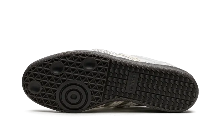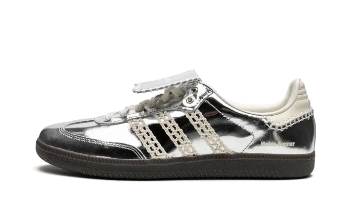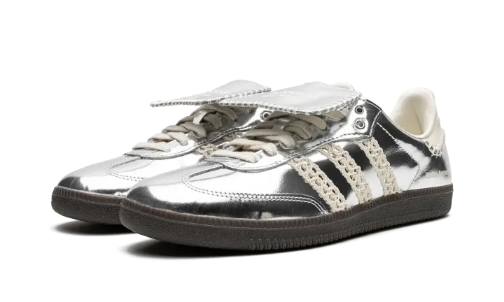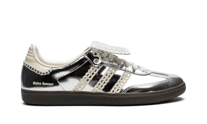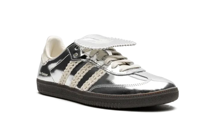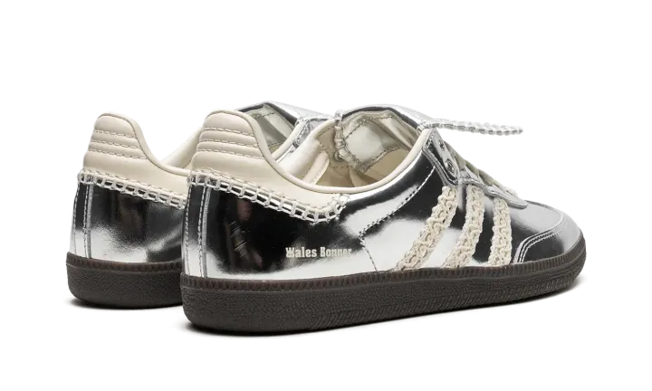 The Wales Bonner x adidas Samba "Silver" is a collaboration by the fashion designer and adidas on the popular sneaker with design elements inspired by its soccer roots. Certainly no strangers to one another, Grace Wales Bonner and adidas have collaborated on numerous occasions since 2020, and their partnership continues to evolve here on the "Silver" Samba. The shoe features a shiny, reflective-like Chrome leather construction with off-white-colored rope Three Stripes stitching on the sides. The same rope-style stitching also appears along the cream leather heel tab overlay. A "Wales Bonner" logo is found on the lateral side of the heel. The shoe's fold-over tongue is a nod to the model's original appearance. A dark gum rubber sole completes the look.