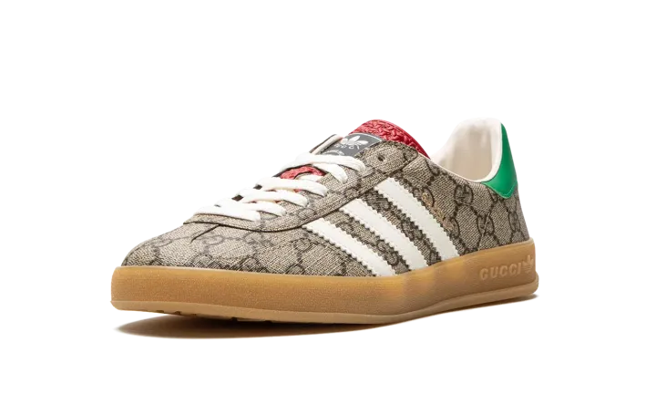 The Gucci x adidas Gazelle "Beige" is a limited edition collaboration by the legendary high fashion house on the popular lifestyle sneaker that features the brand's iconic monogram pattern. Gucci and adidas's second collaboration brings a luxurious twist to the adidas Gazelle by placing the former's "GG" monogram print in an all-over style on the shoe's canvas upper. The look is inspired by 1980s-era sportswear aesthetics. Black leather Three Stripes branding can be found on either side of the shoe while gold co-branding appears on the black leather heel tab. Additional co-branding is found on the tongue. "GG" embossed branding appears on the gum rubber midsole. Release date: March 31, 2023