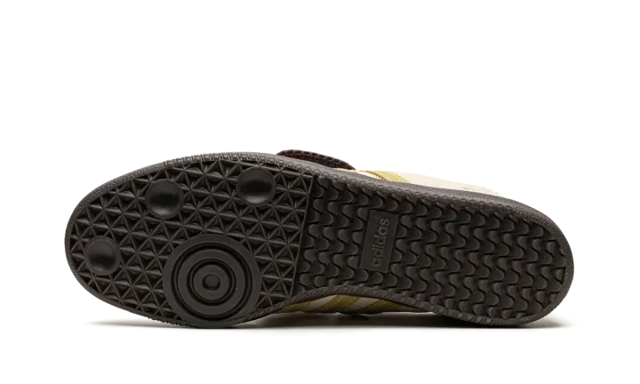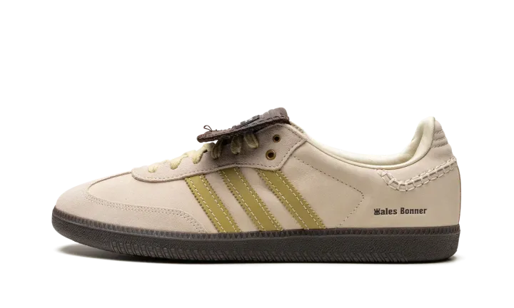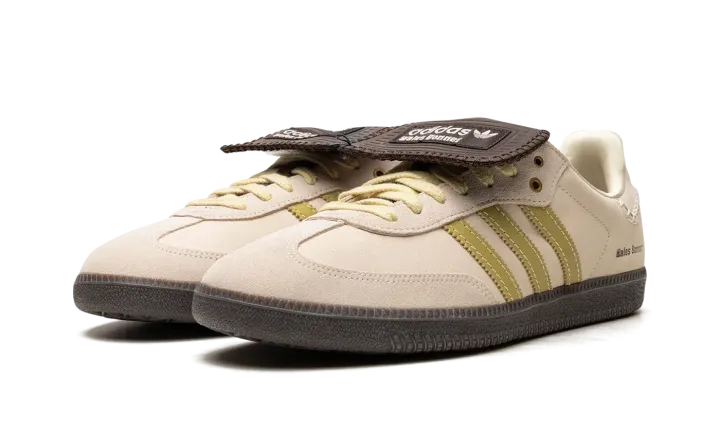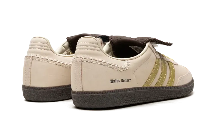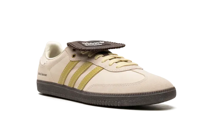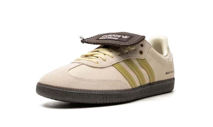 The Wales Bonner x adidas Samba "Cream/Yellow" is a collaboration between the fashion designer and adidas on the popular sneaker that shows appreciation for the model's soccer heritage. One of several colorways of the adidas Samba by Grace Wales Bonner, this edition features a light brown leather construction with tonal suede on the toe. A mustard-like shade of yellow appears on the leather Three Stripes on the sides and a "Wales Bonner" logo is found on the lateral side of the heel. The shoe's fold-over tongue is an acknowledgment to the Samba's original appearance. A dark gum rubber sole completes the look.
