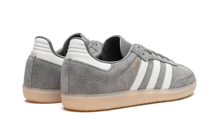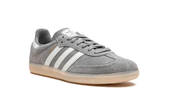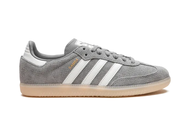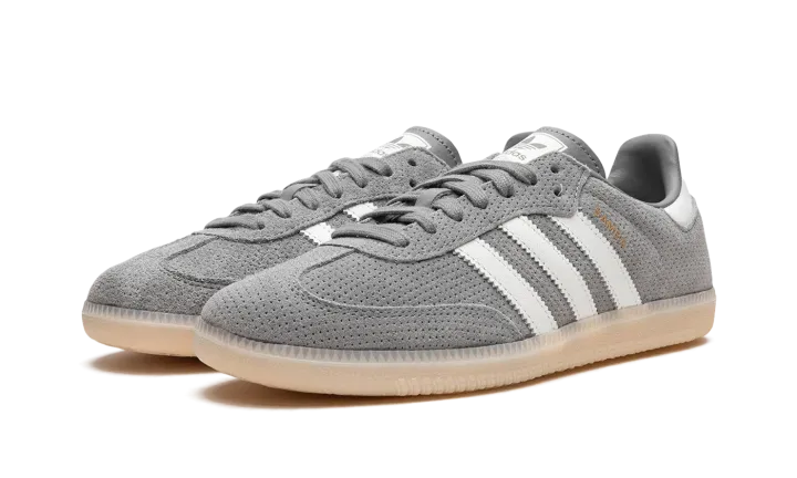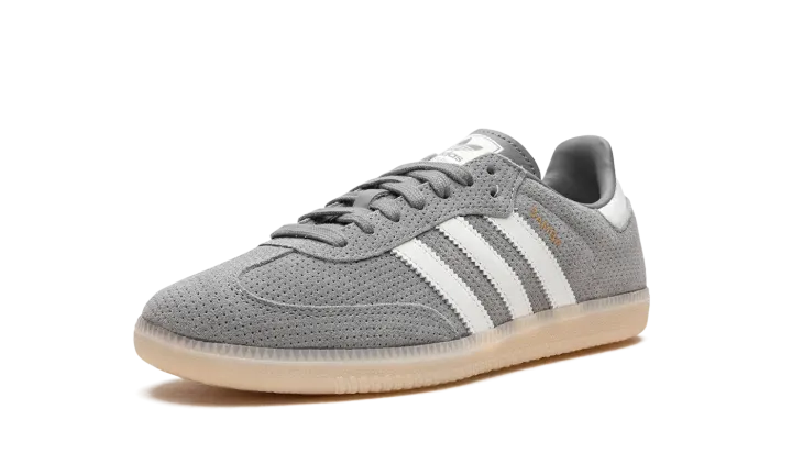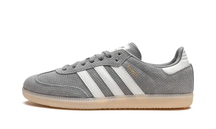 The adidas Samba OG "Grey Bliss" is a neutral colorway of the popular retro indoor soccer and lifestyle shoe. The Samba was one of the most in-demand sneakers of the year in 2022, and its popularity hasn't cooled off since then as the shoe has been featured in a number of big-name collaborations and been released in appealing colorways like the "Grey Bliss." The shoe has a grey perforated leather construction with white leather Three Stripes logos on each side. "Samba" branding appears in gold foil lettering on the lateral side of the shoe's Three Stripes logo. A classic adidas graphic is found on the tongue. Underfoot, a semi-translucent gum rubber sole completes the look.