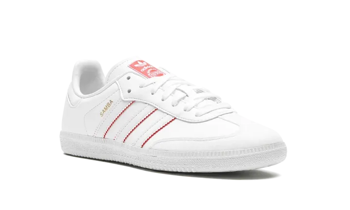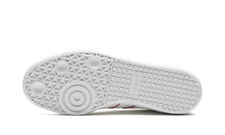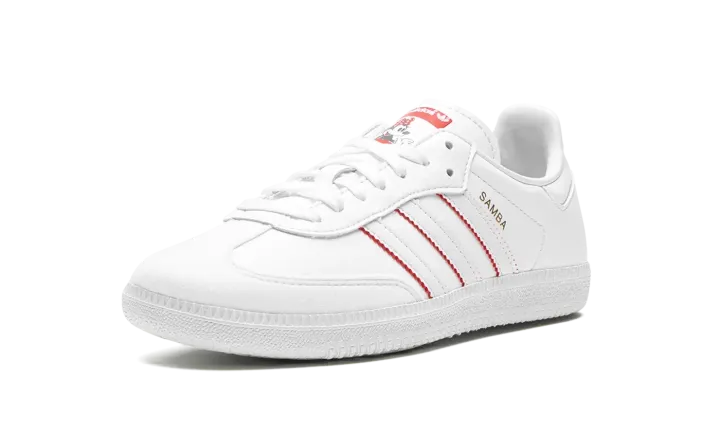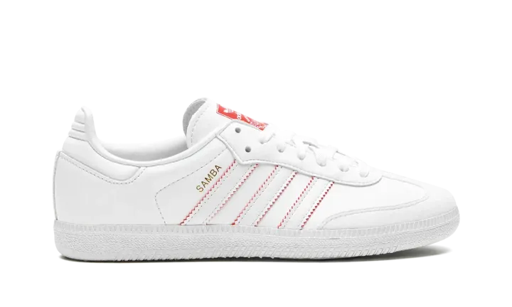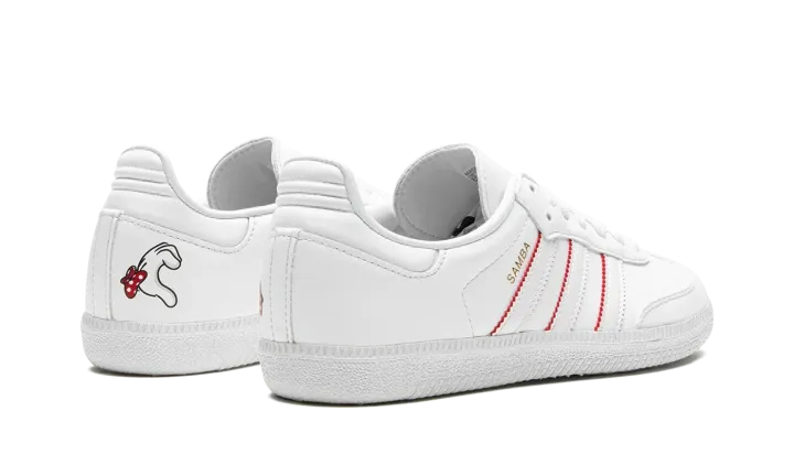 The adidas Samba Vegan "Minnie Mouse" is a creative colorway of the eco-friendly version of the popular lifestyle shoe that is inspired by the iconic Disney character. The adidas Samba Vegan "Minnie Mouse" joins the Samba's "Mickey Mouse" colorway in celebrating Disney's 100th anniversary in 2023. The shoe features a white vegan leather design with "Samba" branding next to the classic Three Stripes detailing with red accents on the sides. Additional red accenting can be found on the tongue, which is inspired by Minnie's red outfit. Minnie's hands are found on the heel of the left and right shoe and form a heart design. Release date: April 27, 2023