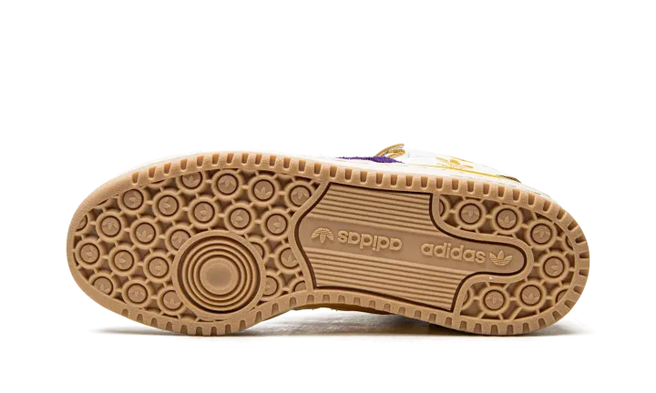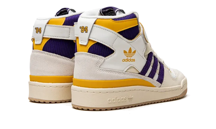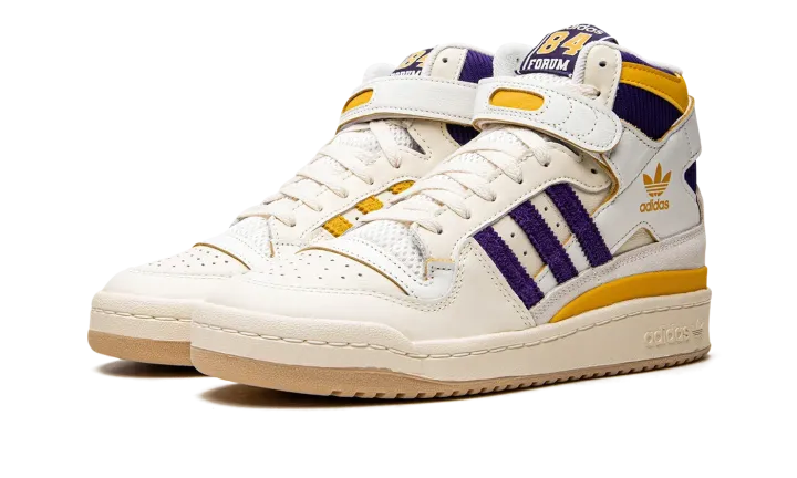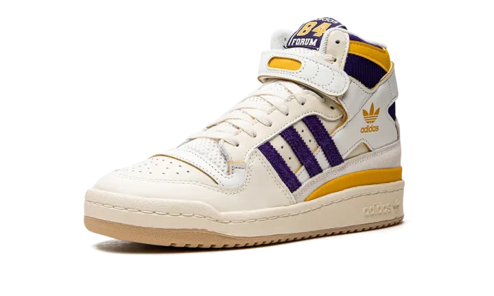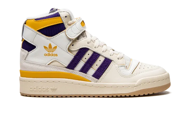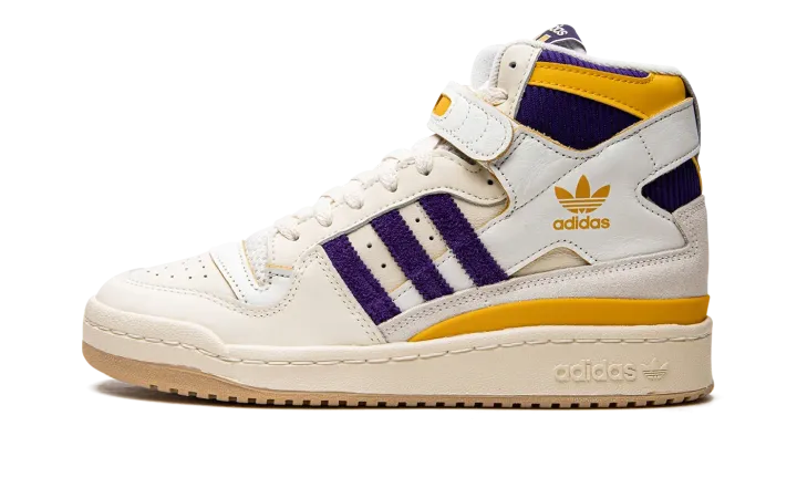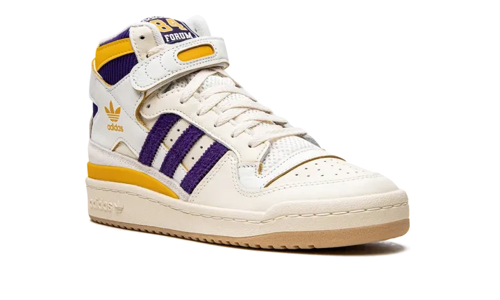 The adidas Forum High 84 "Lakers" is a colorway of the classic basketball sneaker inspired by the Los Angeles Lakers. In spite of its nickname, the adidas Forum Mid is not officially affiliated with the Lakers, although it does draw favorably from the basketball team's uniform colors. The upper features a cream-colored leather base with tonal, purple, and yellow leather overlays. Contrasting purple Three Stripes branding can be found on both sides of the shoe, and an adidas logo appears on the lateral side of the collar. Yellow leather appears around the collar and on the heel. A vintage-inspired cream-colored rubber sole plays into the adidas Forum '84 High's old school vibe.