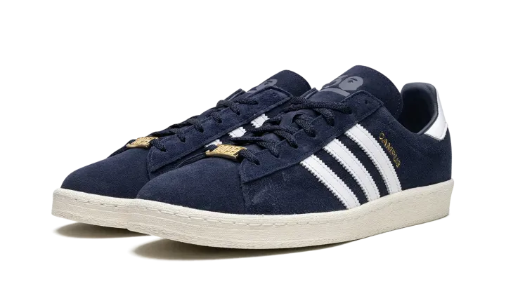 The BAPE x adidas Campus 80 "Collegiate Navy" is a collaboration between the Japanese streetwear brand and adidas on the retro-inspired lifestyle shoe. Celebrating BAPE's 30th anniversary, the adidas Campus 80 in the "Collegiate Navy" colorway features a navy blue suede upper with contrasting white BAPE Sta and Three Stripes branding on the lateral and medial side of the shoe, respectively. An adidas logo appears on the heel of the left shoe and a BAPE logo is found on the heel of the right shoe. A gold "BAPE" lace dubrae gives the shoe a luxurious vibe. Release date: April 1, 2023