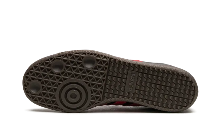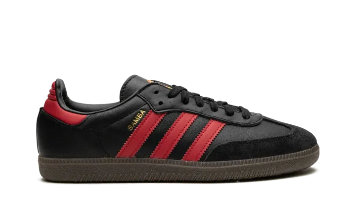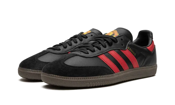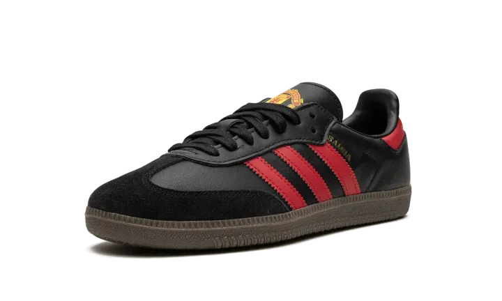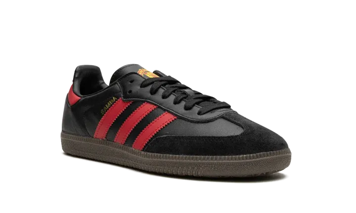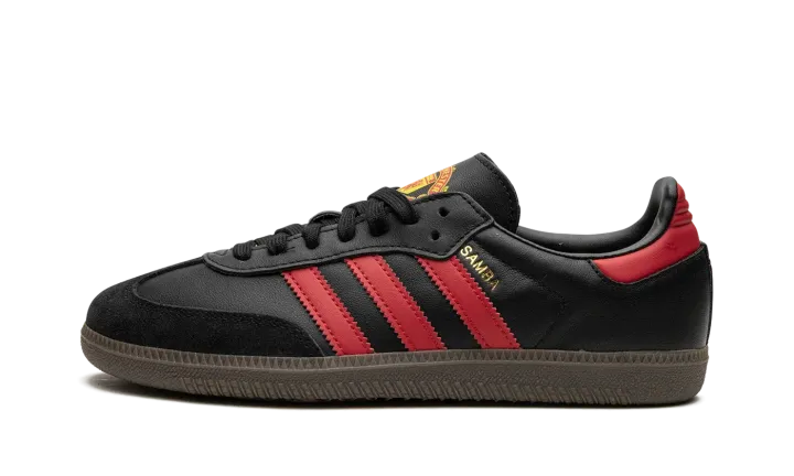 The adidas Samba "Manchester United" is a special colorway of the iconic sneaker for fans of the storied soccer club. Manchester United's colors and branding found on its kits are applied to the adidas Samba to great success. The shoe is complete with a black leather base with red leather Three Stripes detailing on the sides. Additional red leather can be found on the heel. A "Manchester United" graphic is located on the tongue. A dark gum rubber sole completes the look.