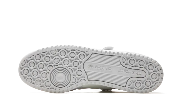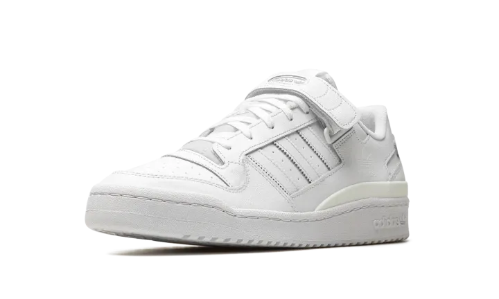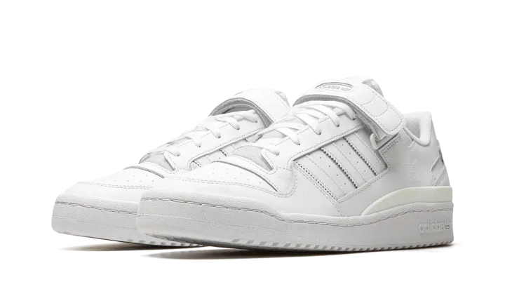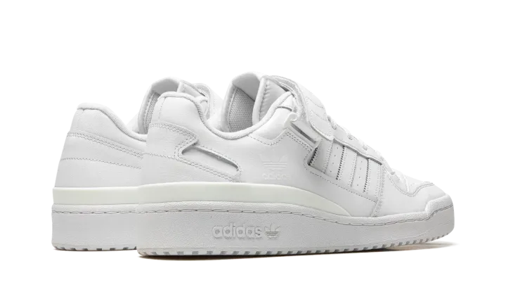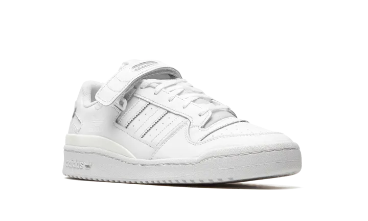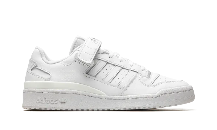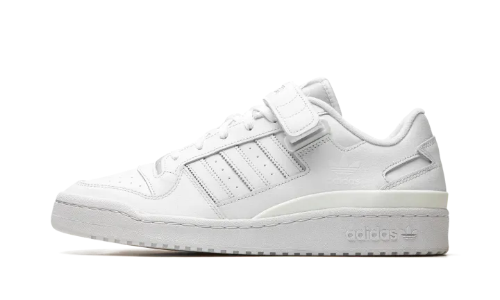 The adidas Forum Low "Triple White" is a monochromatic white colorway of the retro basketball shoe. The Forum Low is an old school basketball sneaker that is currently one of the brand's most popular and versatile lifestyle shoes, especially in this "Triple White" edition. The shoe features a white leather construction with tonal leather overlays. White leather Three Stripes branding appears on the mid-panel. The shoe's adjustable ankle strap is also made of white leather. Underfoot, a white rubber sole completes the sneaker's all-white-everything look.