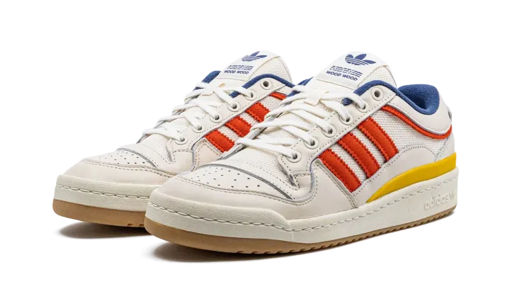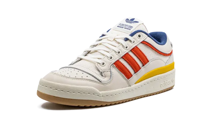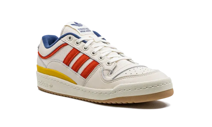 The Wood Wood x adidas Forum Low "White/Red" is a collaboration by the Copenhagen based clothing brand and adidas on the vintage basketball shoe. Wood Wood's vision for the adidas Forum Low updates the classic sneaker's design by removing its signature velcro strap for a more streamlined appearance. The shoe features a white leather base with a tonal mesh construction on the sides. Adidas's signature Three Stripes branding is found in red on either side of the shoe. Elsewhere, yellow trim accents the heel and the interior of the shoe is finished in blue terry cloth. Dual "Wood Wood" and adidas logos are found on the tongue. Release date: July 21, 2022