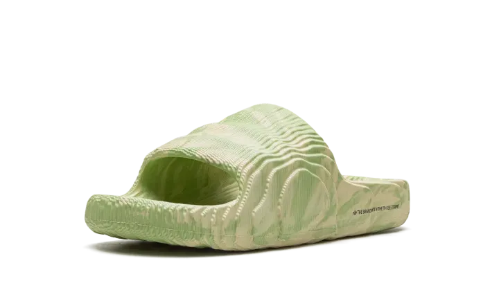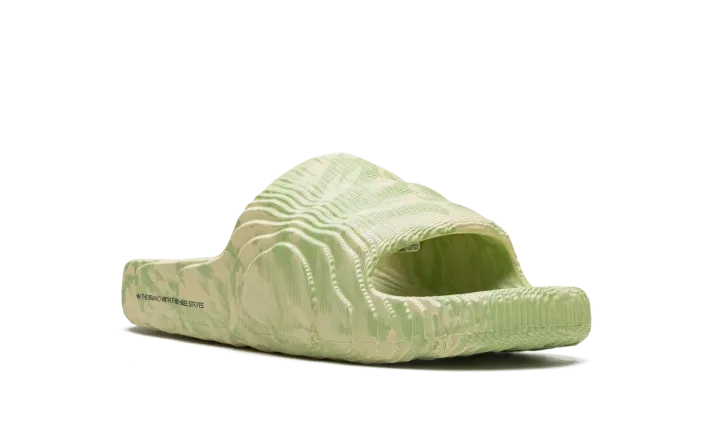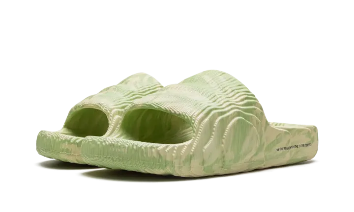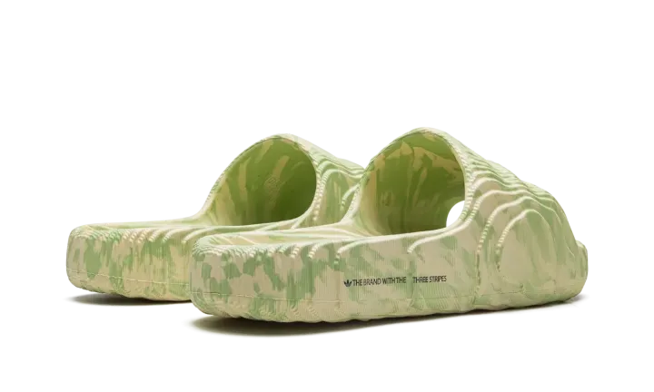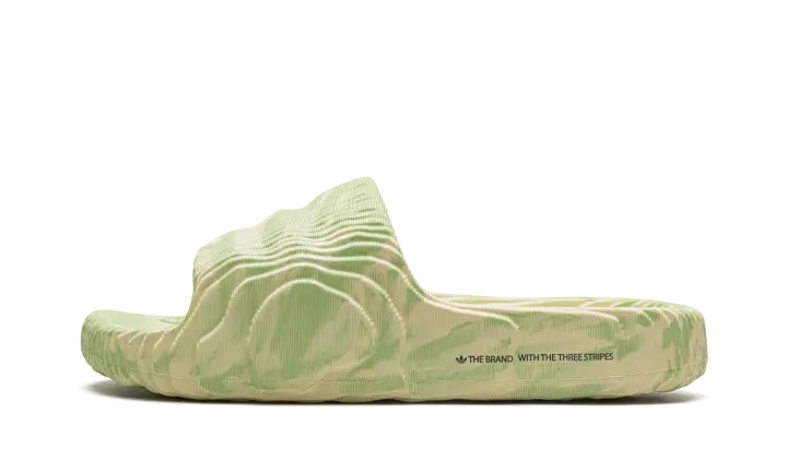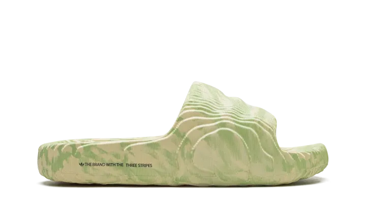 The adidas Adilette 22 "Magic Lime/Desert Sand" is a unique colorway of the casual slip-on sandal constructed from environmentally-friendly materials that features swirls of cream and lime green in its design. Reminiscent of Kanye West's adidas Yeezy Slide, the Adilette 22 features a futuristic design with wavy lines inspired by 3D topography. The body is made from lightweight EVA foam that contains up to 25% plant-based ingredients derived from sugarcane. Swirls of cream and lime green are blended into the design of the sandal. "The Brand With the Three Stripes" detailing is printed on the lateral side of the footbed.