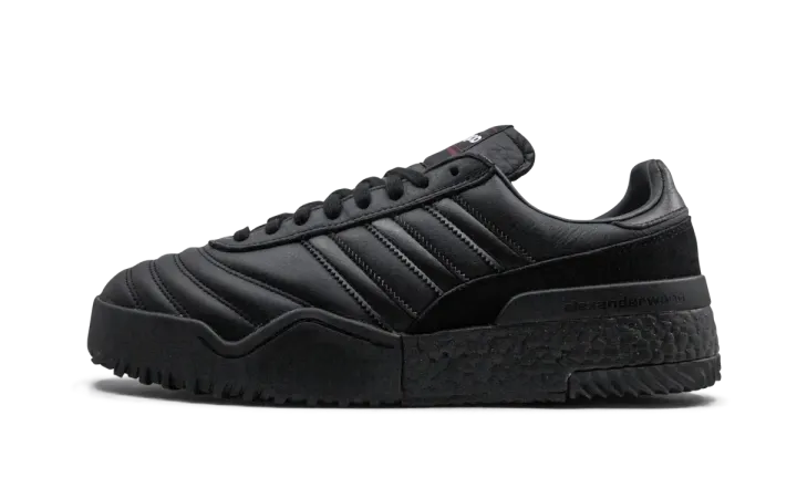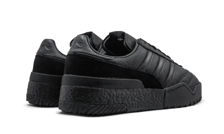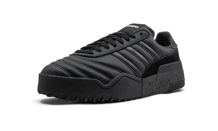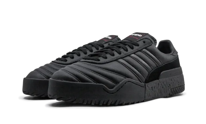 The Alexander Wang x adidas Bball Soccer shoe introduces high-fashion design to the adidas Bball silhouette, as part of the famous collaboration between fashion designer Alexander Wang and adidas. For this collection, Wang zeroed in on a "factory imperfection" theme. The amped-up lifestyle silhouette is made with a triple-black application of leather and suede materials on the upper and a thick midsole with black Boost cushioning. Unexpected details include upside-down adidas branding on the tongue tag, side, and heel.