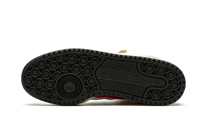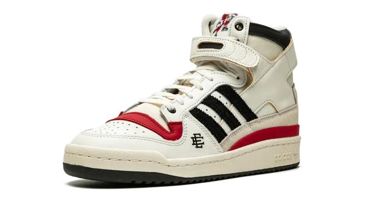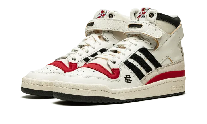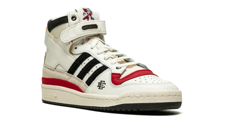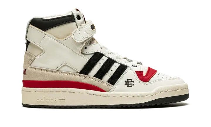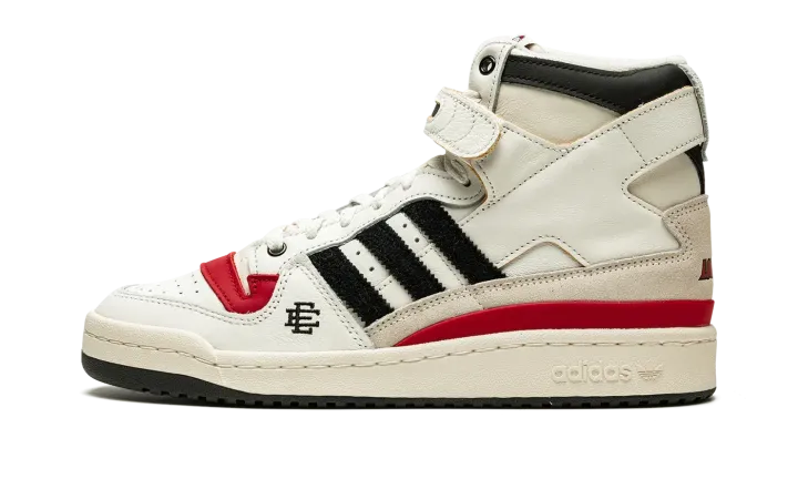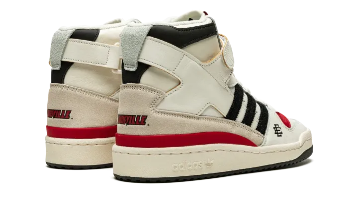 The Eric Emanuel x adidas Forum 84 Hi "Louisville" is a December 2021 collaboration by the fashion designer on the vintage basketball shoe in a colorway dedicated to the Louisville Cardinals. Emanuel's collaboration on the Forum 84 Hi in the "Louisville" colorway is one of multiple college basketball makeups of the shoe released in 2021, which includes styles made up in the honor of the Kansas Jayhawks and Indiana Hoosiers. Here, though, the "Louisville" features mostly light cream-colored leather appearance with tonal overlays. A black felt Three Stripes branding hit appears on the sides. "Louisville" branding in red is found on the sand-colored suede heel overlay on the back of the shoe. Additional iconography exclusive to the Louisville Cardinals college basketball team appears in the form of the school's mascot, Cardinal Bird, on the tongue tag. Navy "EE" detailing can be found on the lateral side of the forefoot. A black tumbled leather overlay appears on the collar above the adjustable white leather ankle strap. Finishing touches include a cream rubber midsole and contrasting black outsole. Release date: December 13, 2021
