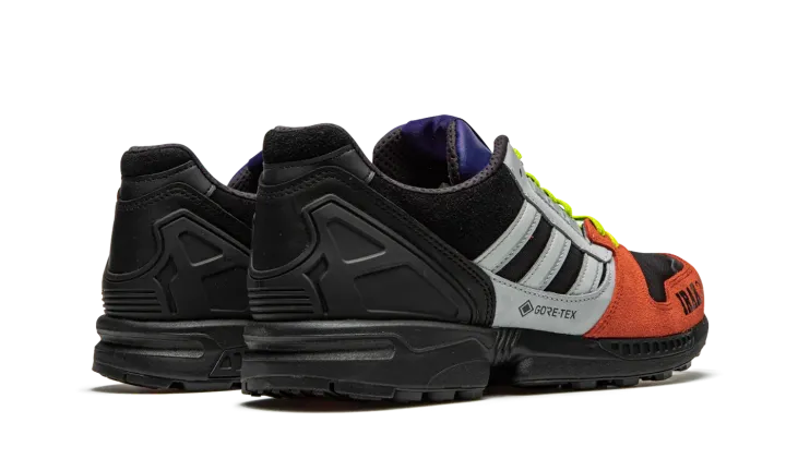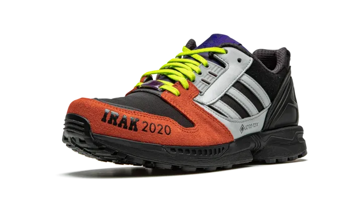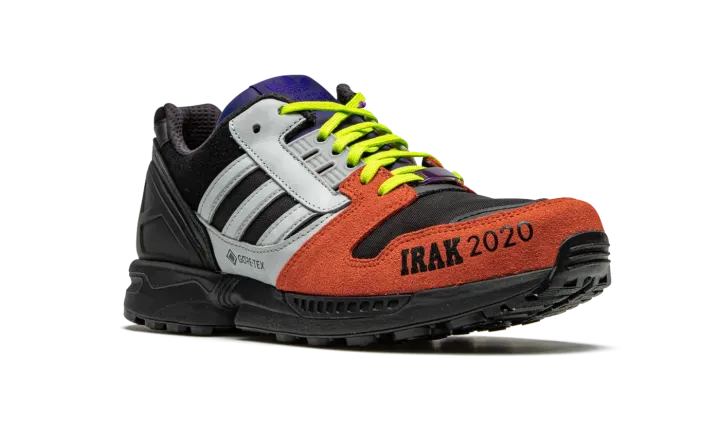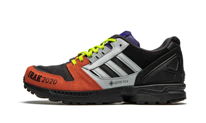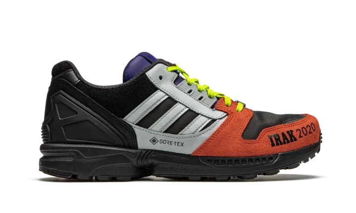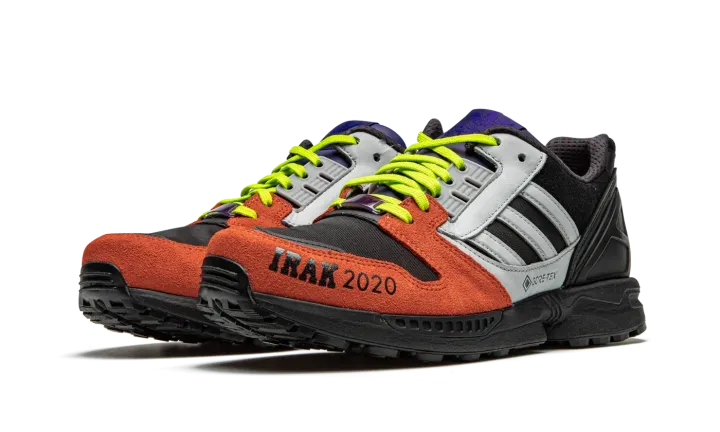 The IRAK x adidas ZX 8000 GTX "Orange/Black" is one of two colorways created by the New York City graffiti crew in collaboration with adidas. Back in 2007 and 2008, adidas enlisted Kunle "Earsnot" Martins and members of the IRAK graffiti collection to apply their artistry to the brand's ZX 8000 GTX silhouette. Featuring a vibrant color scheme that matches the personalities of each member of IRAK, the two late-aughts releases are considered some of the best collaborations under adidas's umbrella. Here, this "Orange/Black" look is a return to form. Hairy burnt orange suede dots the toe cap. Silver "IRAK 2020" branding is printed onto the material as a salute to the styling of the original IRAK x adidas collection. Weather resistant GORE-TEX insulation keeps your feet protected against the elements. Silver leather Three Stripes detailing dots either side. Bold lime green cotton laces, a blue nylon tongue, and black synthetic overlays on the heel completes the look. Release date: August 28, 2020.