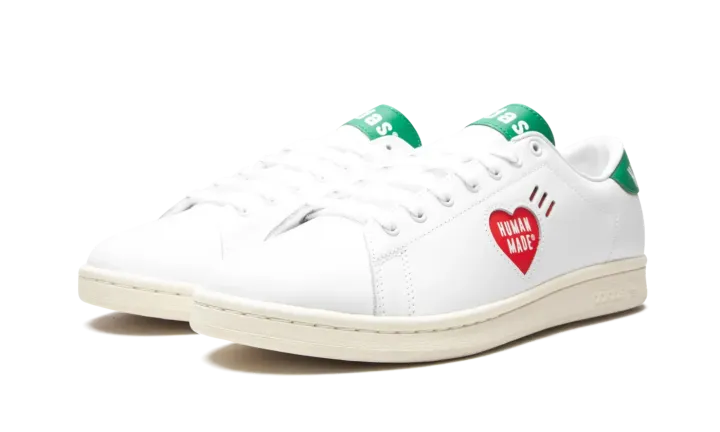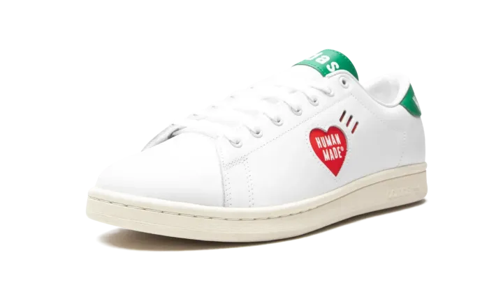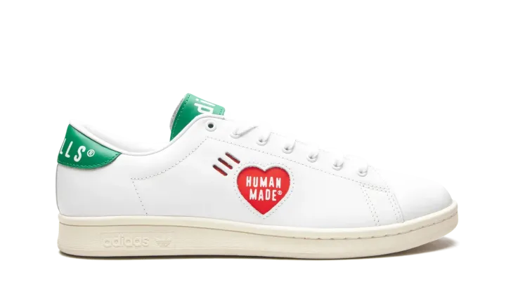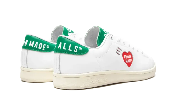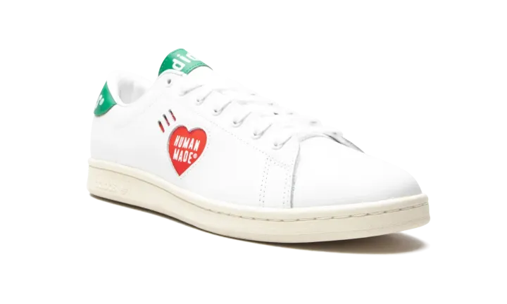 White leather x Human Made Stan Smith sneakers from adidas featuring logo print to the side, logo patch at the tongue, branded heel counter, round neck, front lace-up fastening and flat rubber sole. POSITIVELY CONSCIOUS: adidas Group scores 4 out 5 with independent ethical brand rating agency Good On You. It uses eco-friendly materials in many products - 100% of its cotton is from sustainable sources and it's committed to use 100% recycled polyester by 2024. It traces and audits almost all of its supply chain to ensure good labour standards, and has committed to reduce carbon and water stress across its whole supplier base.