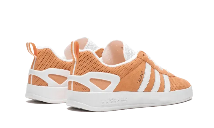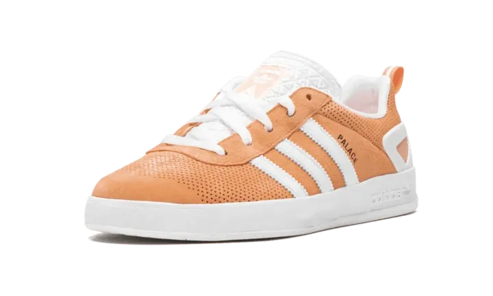 The adidas Palace Pro "Pumpkin" is a collaborative skate shoe by the UK-based skateboard and streetwear brand and adidas Originals. The model was designed specifically by and for Palace, taking inspiration from adidas soccer shoes from the brand's archives, namely the Gazelle and Samba. This colorway features an orange suede upper with white accents on the tongue, Three Stripe branding, TPU heel counter, and rubber outsole. Dual logos are seen on the tongue, while "Palace" is stamped in gold foil on the midfoot in classic adidas style. The adidas Palace Pro "Pumpkin" released in 2015.