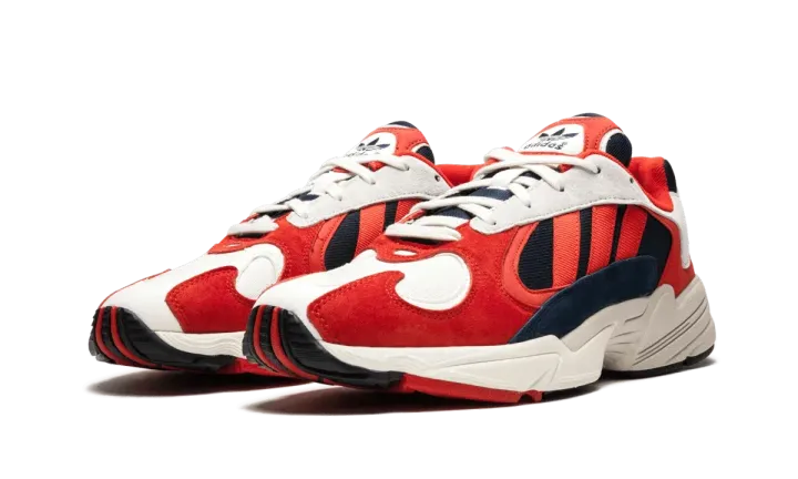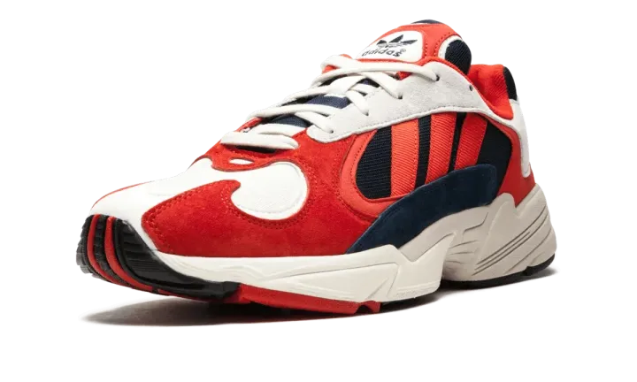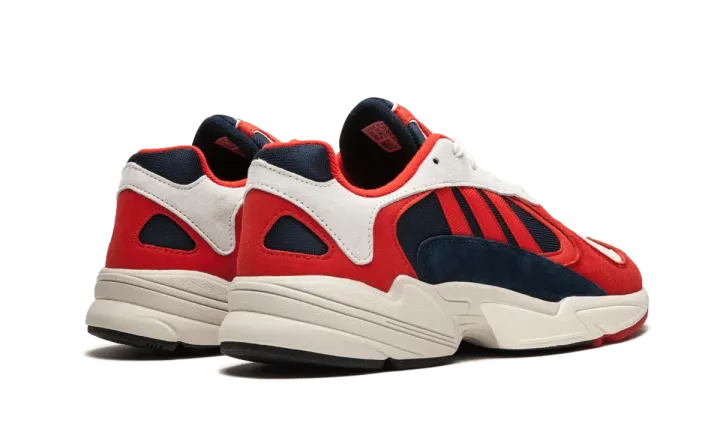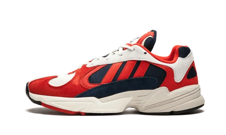 The adidas Yung-1 is an adidas Originals model debuted by the brand in May 2018. The silhouette takes cues from the adidas '90s archive, more specifically 1997's Falcon Dorf. The chunky runner perfectly found a place for itself as part of 2018's "dad shoe" trend. It features a mesh upper, nubuck overlays, a Trefoil logo on the tongue, and nylon Three Stripes on the side panel. This colorway of the adidas Yung-1 features a white upper, red and blue detailing, and a cream midsole.